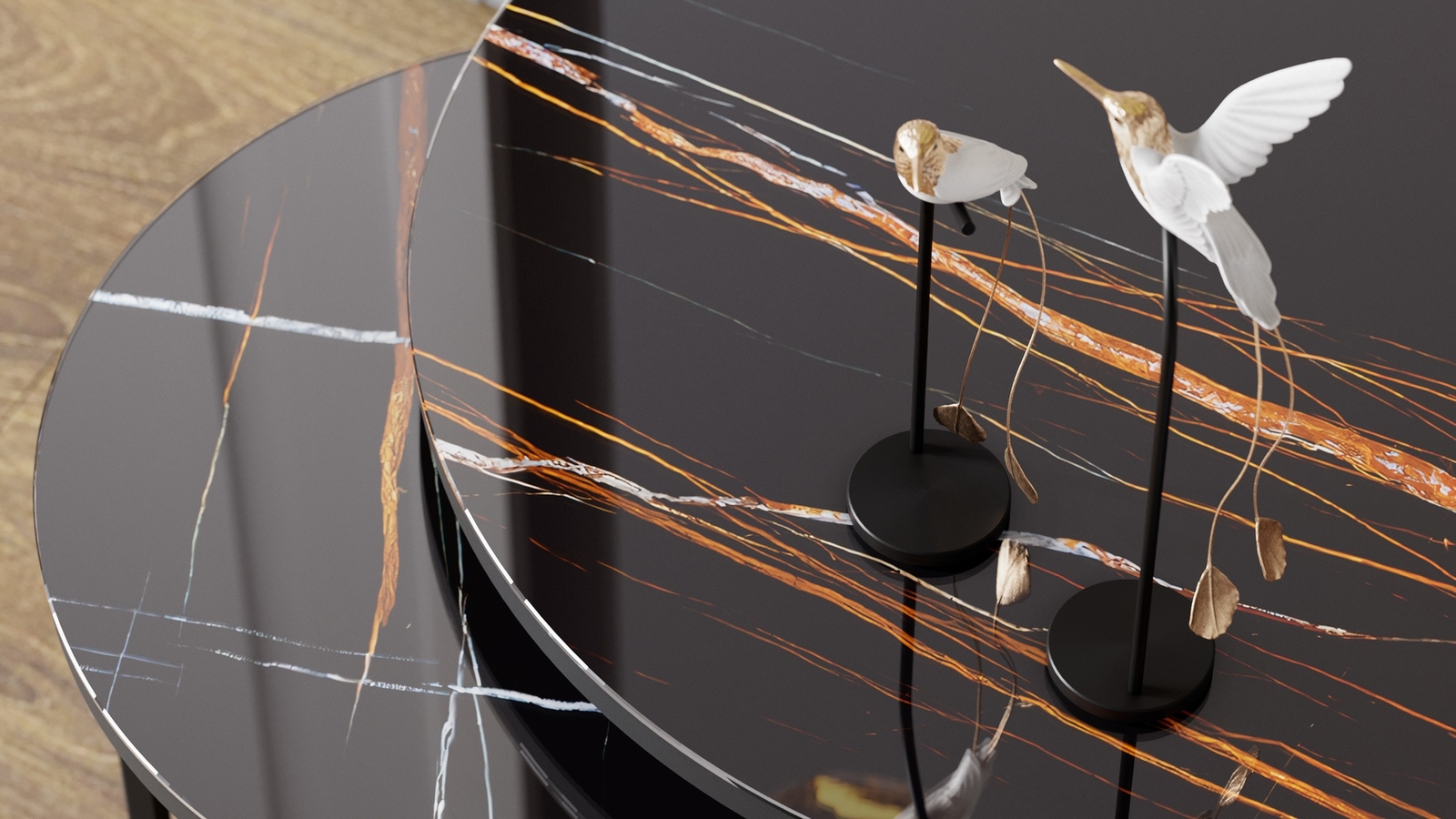 Комплект столов журнальных «Стелла» представляет собой гармоничную и функциональную композицию из двух столиков разной высоты и диаметра, расположенных один над другим. Дизайнерский прием - способность разместить данную модель любым комфортным способом или использовать каждый из них по отдельности. Стеклянная столешница с УФ-печатью с точностью передает естественную красоту рисунка. Основание полностью изготовлено из прочного металла, а черный цвет опор лаконичен и безупречен в своем блестящем металлическом исполнении. Благодаря своей строгой элегантности и универсальности журнальные столики легко комбинируются с мебелью в современном стиле. Продукция поставляется в разобранном виде, упакованная в гофрокартон. В комплект входит вся необходимая фурнитура и удобная инструкция для сборки. Максимальная нагрузка до 40 кг.