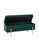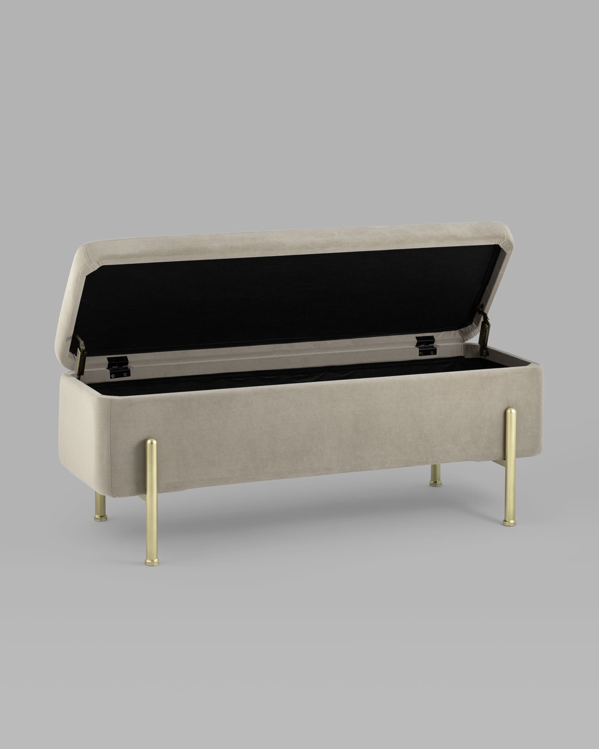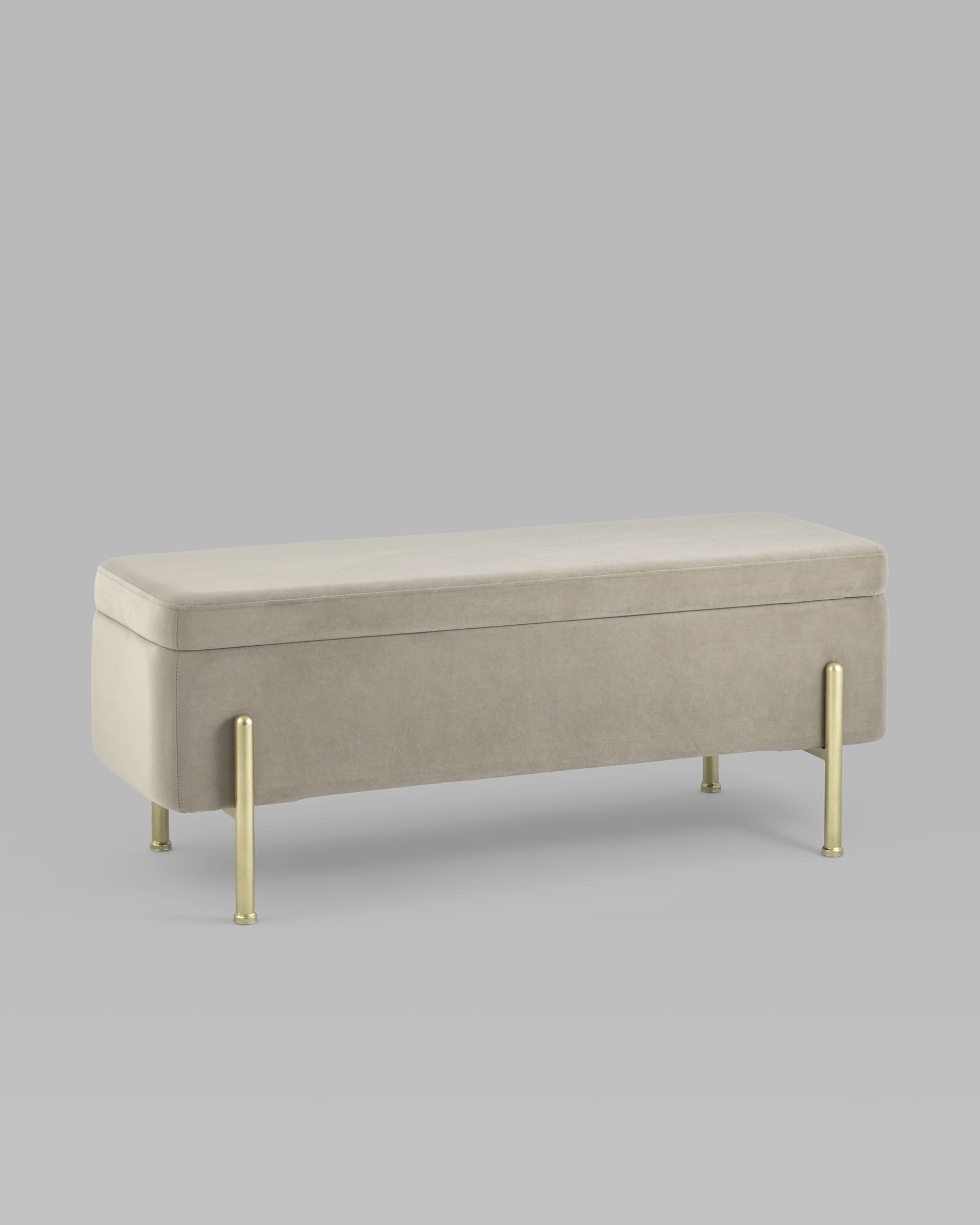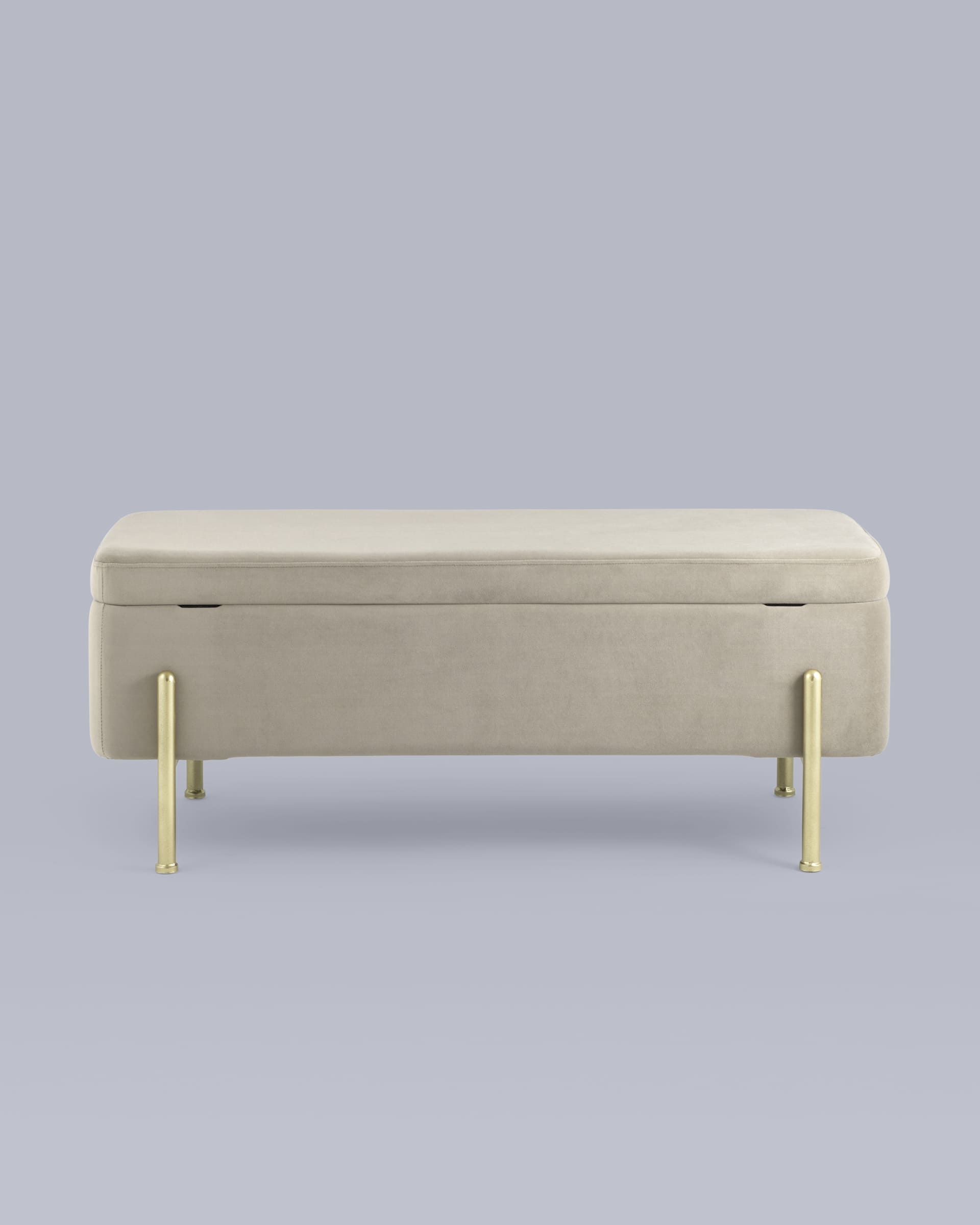 Стильная модель банкетки в обивке из мягкого велюра, прекрасно дополнит интерьер спальни или прихожей. Изящные ножки выполнены из металла в золотом цвете. Под сидением имеется ящик для хранения необходимых вещей. На ножках предусмотрены мягкие накладки, которые предотвращают повреждения напольного покрытия.