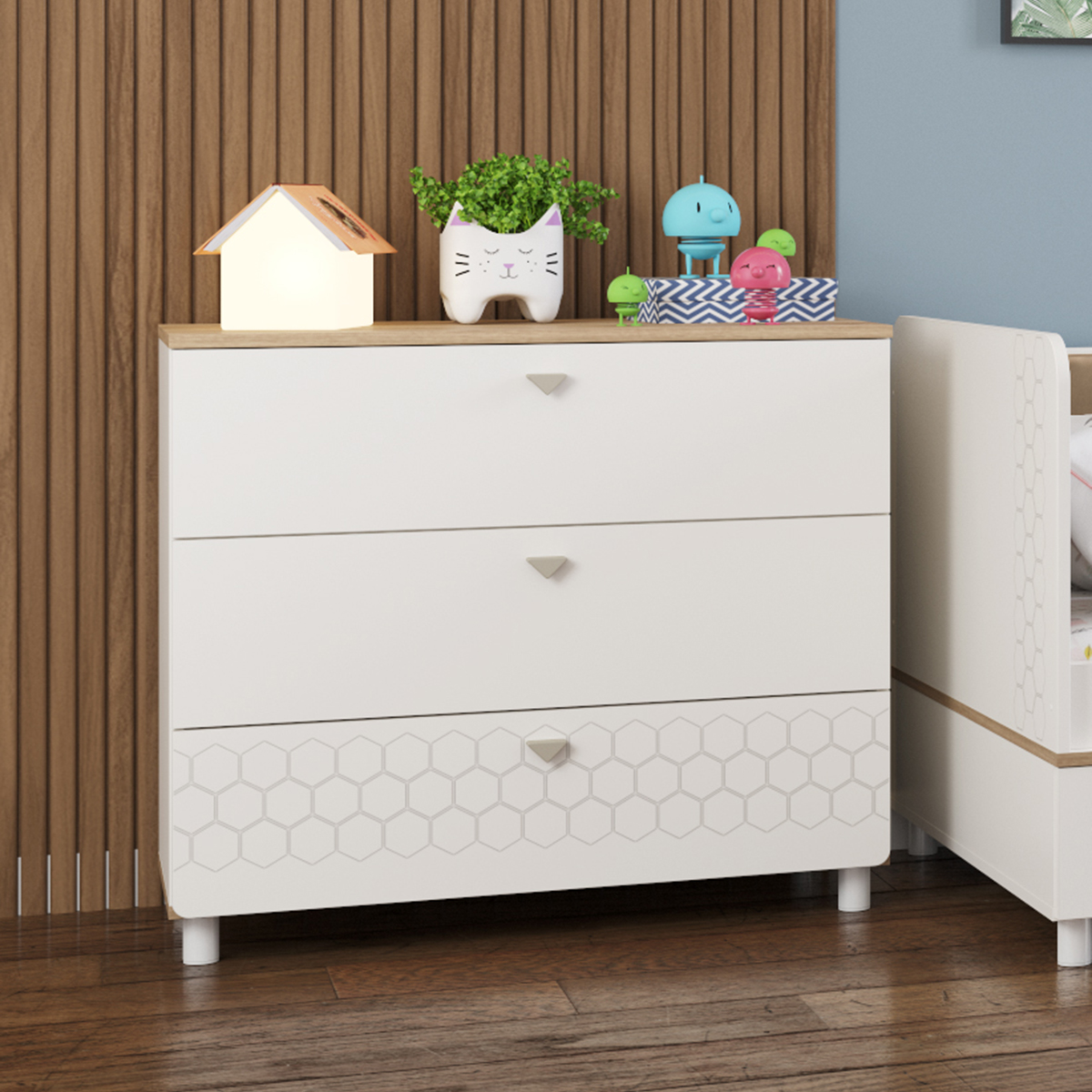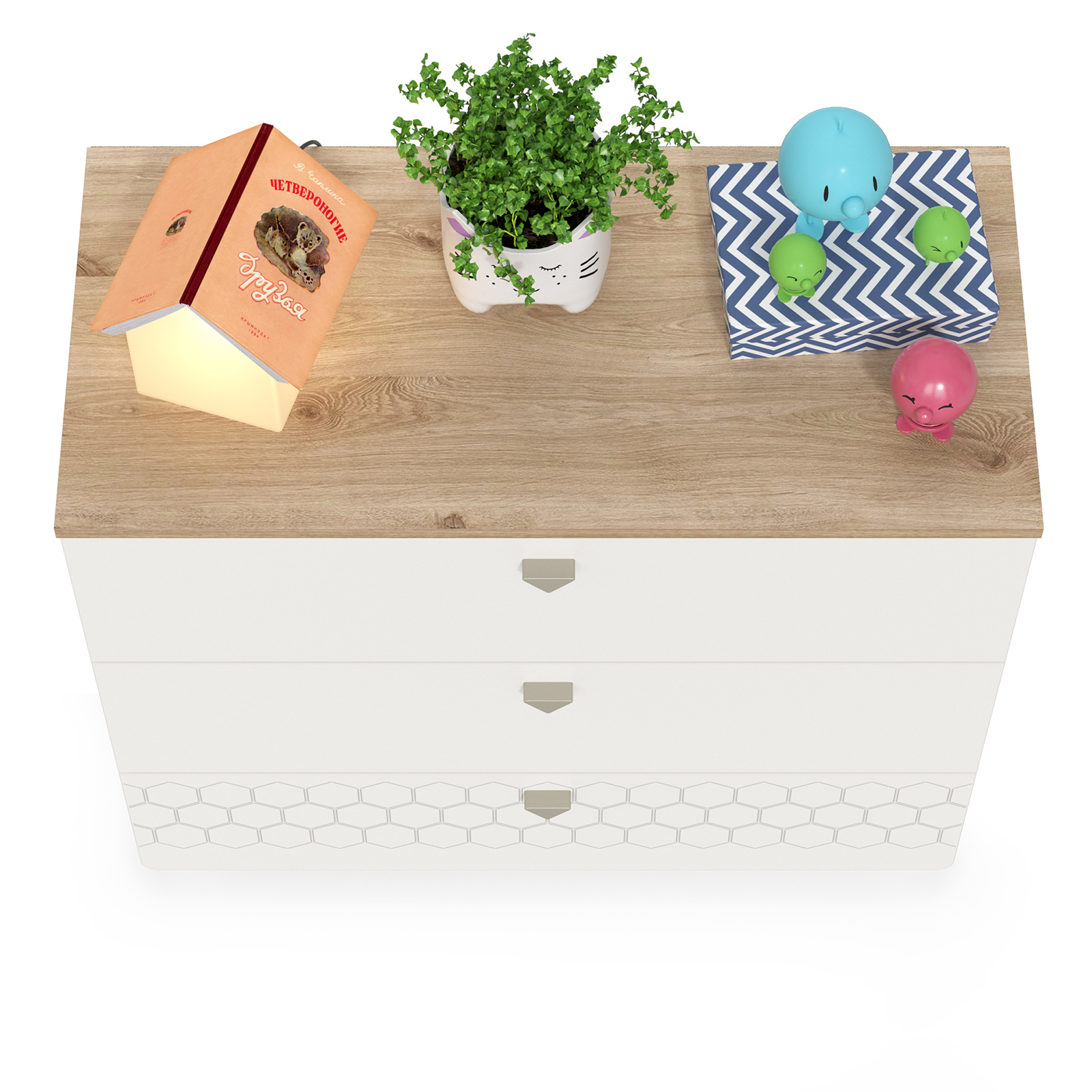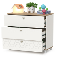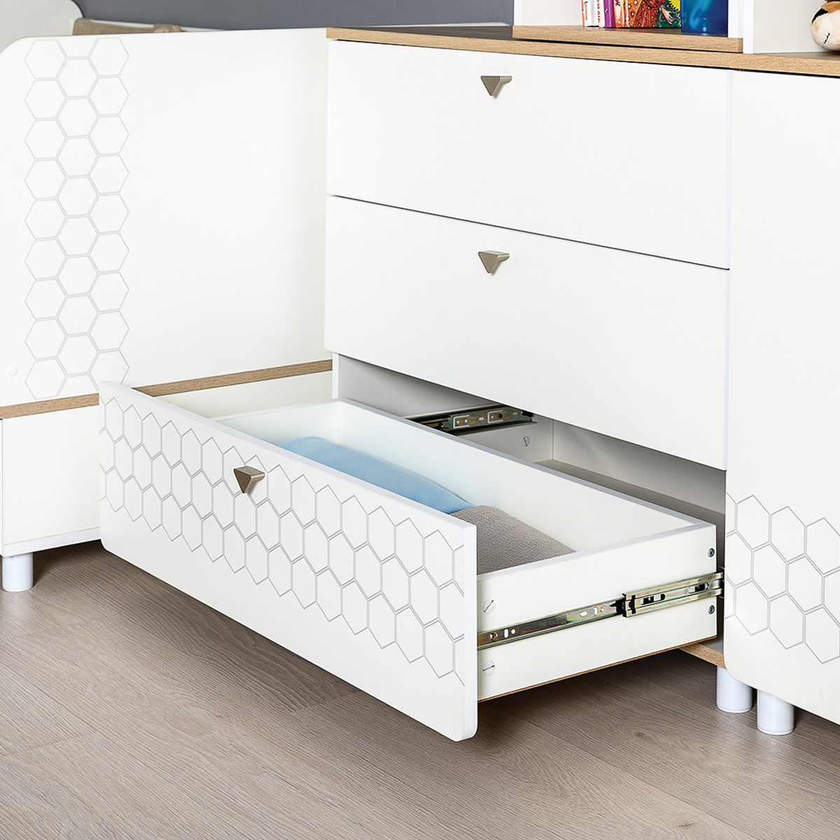 Cистема хранения комода предствлена тремя выдвижными ящиками на шариковых направляющих полного выдвижения. На фасадах скандинавские геометрические мотивы универсального цветового решения делают эту мебель подходящей и девочкам, и мальчикам. Опоры - регулируемые, что позволяет легко компенсировать неровности пола. Изготовлена мебель из экологически чистой ламинированной ДСП 16 мм, торцы окромлены ПХВ плёнкой. Толстая кромка — все выступающие части кровати закрыты прочной и безопасной кромкой толщиной 2 мм. Лицевая фурнитура - минималистичные пластиковые ручки. В производстве использованы качественные материалы и фурнитура - можно разрабатывать проект на весь период обучения. Выдвижные ящики на шариковых направляющих полного выдвижения обеспечивают длительную и тихую эксплуатацию. Поставляется в разобранном виде в надёжной упаковке, с комплектом сборочной фурнитуры и инструкцией по сборке.
