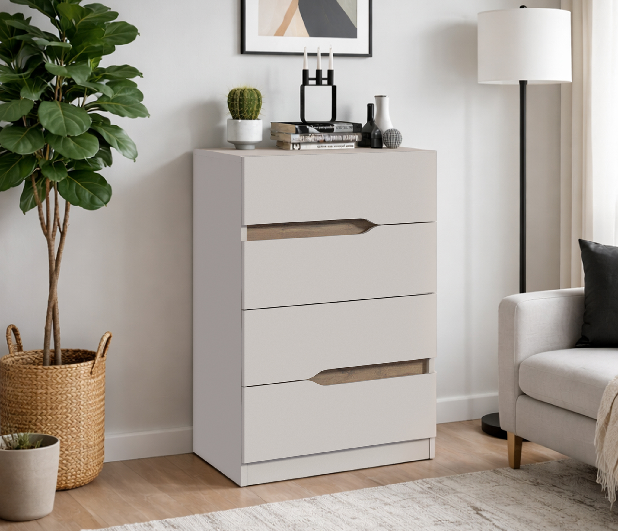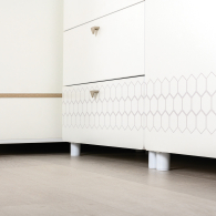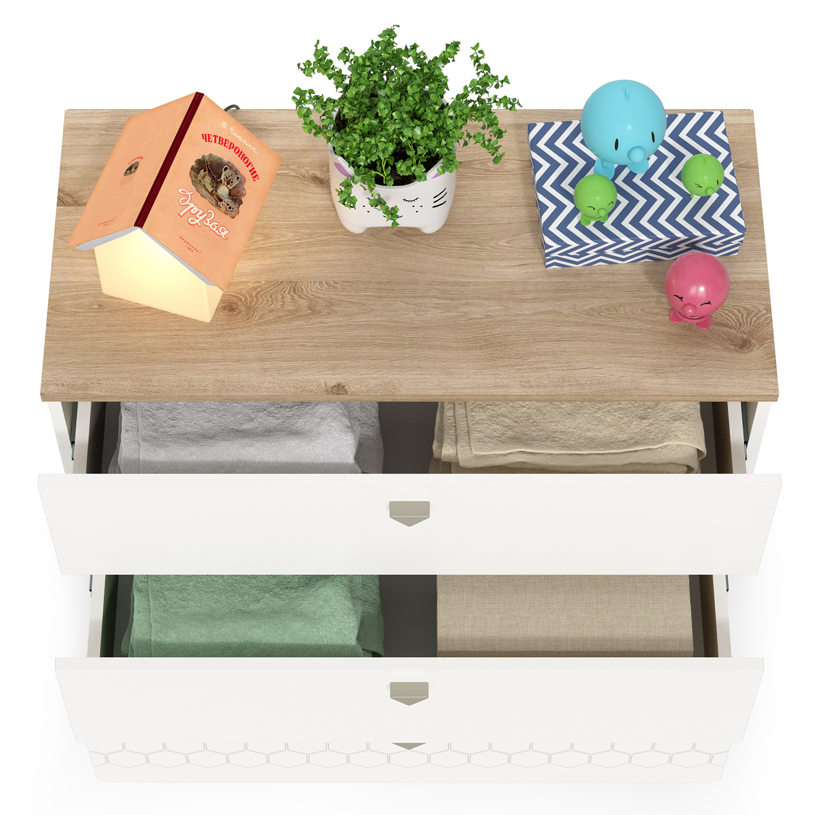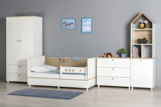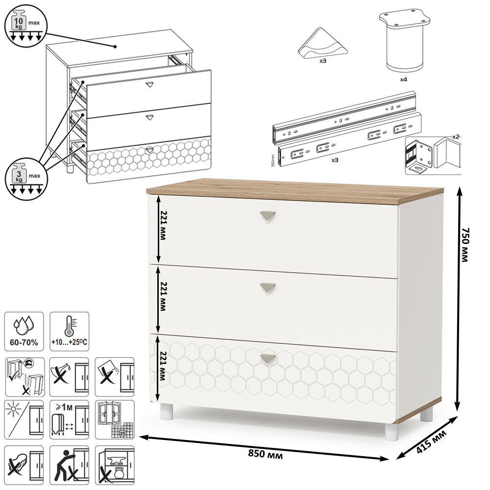 Cистема хранения комода предствлена тремя выдвижными ящиками на шариковых направляющих полного выдвижения. На фасадах скандинавские геометрические мотивы универсального цветового решения делают эту мебель подходящей и девочкам, и мальчикам. Опоры - регулируемые, что позволяет легко компенсировать неровности пола. Изготовлена мебель из экологически чистой ламинированной ДСП 16 мм, торцы окромлены ПХВ плёнкой. Толстая кромка — все выступающие части кровати закрыты прочной и безопасной кромкой толщиной 2 мм. Лицевая фурнитура - минималистичные пластиковые ручки. В производстве использованы качественные материалы и фурнитура - можно разрабатывать проект на весь период обучения. Выдвижные ящики на шариковых направляющих полного выдвижения обеспечивают длительную и тихую эксплуатацию. Поставляется в разобранном виде в надёжной упаковке, с комплектом сборочной фурнитуры и инструкцией по сборке.