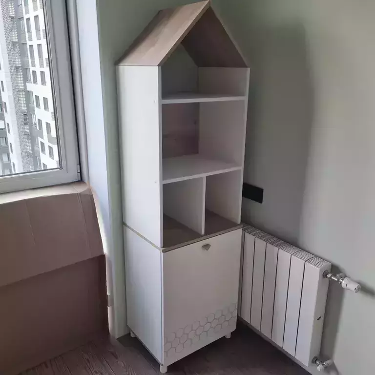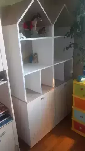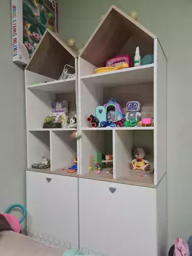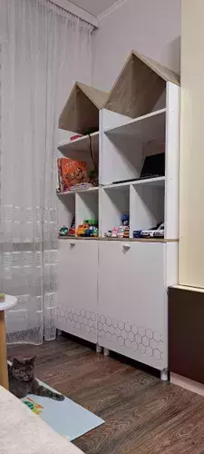 Конструктивно это два стеллажа Эйп 13.14 объединенных в единый блок. Каждый стеллаж представляет 5 ярусов, нижние два за распашной дверкой. Верхняя часть стеллажа выполнена в виде крыши домика, что несомненно будет радовать малыша. Дверь при сборке можно установить на любую сторону. На фасаде скандинавские геометрические мотивы универсального цветового решения делают эту мебель подходящей и девочкам, и мальчикам. Опоры - регулируемые, что позволяет легко компенсировать неровности пола. Изготовлена мебель из экологически чистой ламинированной ДСП 16 мм, торцы окромлены ПХВ плёнкой. Толстая кромка — все выступающие части кровати закрыты прочной и безопасной кромкой толщиной 2 мм. Лицевая фурнитура - минималистичные пластиковые ручки. В производстве использованы качественные материалы и фурнитура - можно разрабатывать проект на весь период обучения. Распашные двери на четырёхшарнирных петлях без доводчиков. Поставляется в разобранном виде в надёжной упаковке, с комплектом сборочной фурнитуры и инструкцией по сборке.