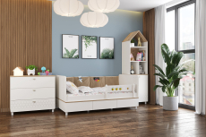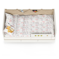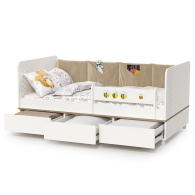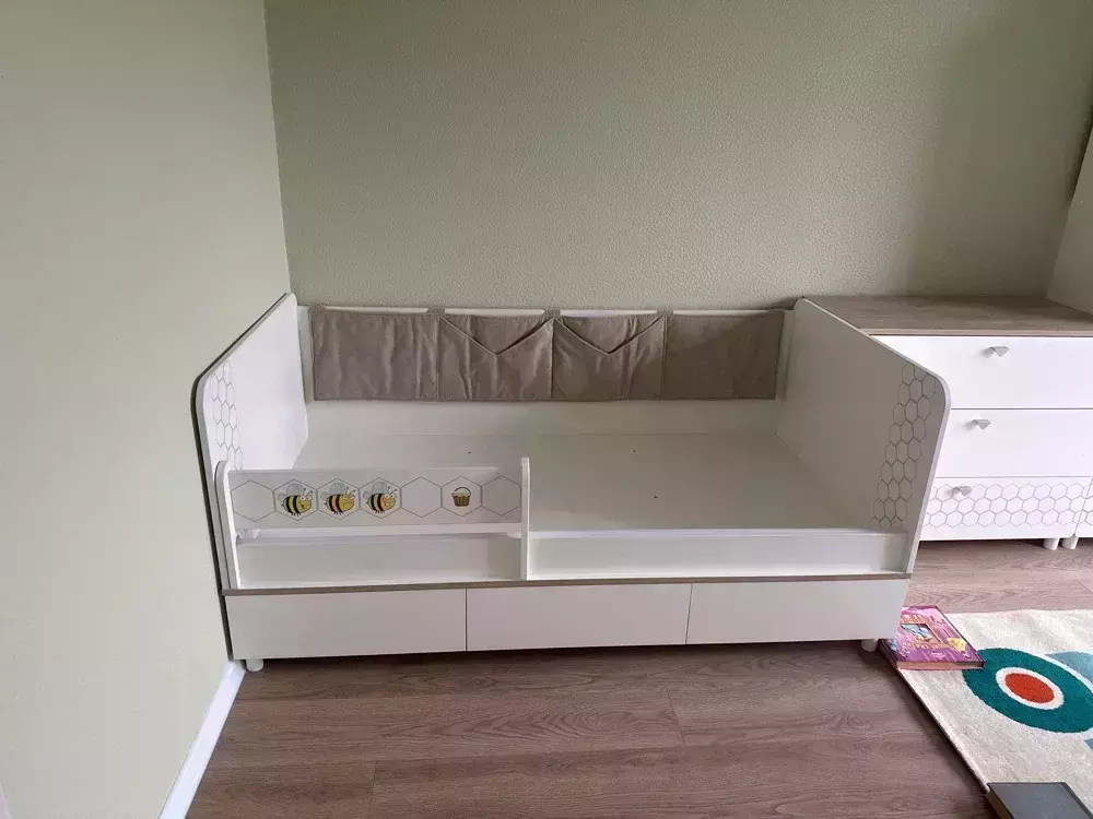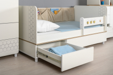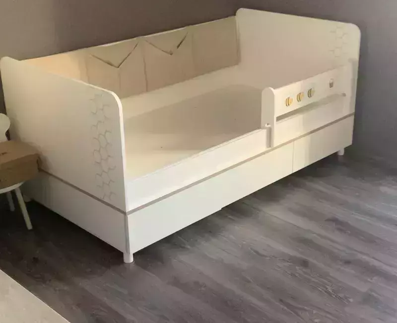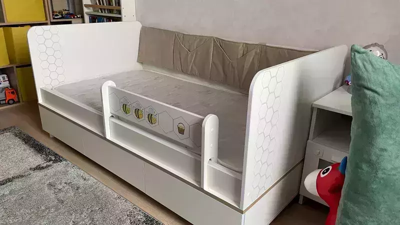 Односпальная кровать Эйп оснащена съёмным мягким элементом с карманами — можно легко снять для стирки. Съёмный бортик на кроватке — это надежная защита от беспокойного сна Вашего малыша. Оригинальная фотопечать - мультяшные пчёлки, которые никого не оставят равнодушным. Спальное место 800х1600 мм., основание под матрас в комплекте (настил ЛДСП). Матрас для этой кровати приобретается отдельно. Рекомендуемая высота матраса 120 мм. В основании кроватки размещены - три выкатных ящика для постельных принадлежностей и личных вещей ребёнка. На фасаде скандинавские геометрические мотивы универсального цветового решения делают эту мебель подходящей и девочкам, и мальчикам. Опоры - регулируемые, что позволяет легко компенсировать неровности пола. Изготовлена мебель из экологически чистой ламинированной ДСП 16 мм, торцы окромлены ПХВ плёнкой. Толстая кромка — все выступающие части кровати закрыты прочной и безопасной кромкой толщиной 2 мм. Лицевая фурнитура - минималистичные пластиковые ручки. В производстве использованы качественные материалы и фурнитура - можно разрабатывать проект на весь период обучения. Выдвижные ящики на шариковых направляющих полного выдвижения обеспечивают длительную и тихую эксплуатацию. Распашные двери на четырёхшарнирных петлях без доводчиков. Поставляется в разобранном виде в надёжной упаковке, с комплектом сборочной фурнитуры и инструкцией по сборке.