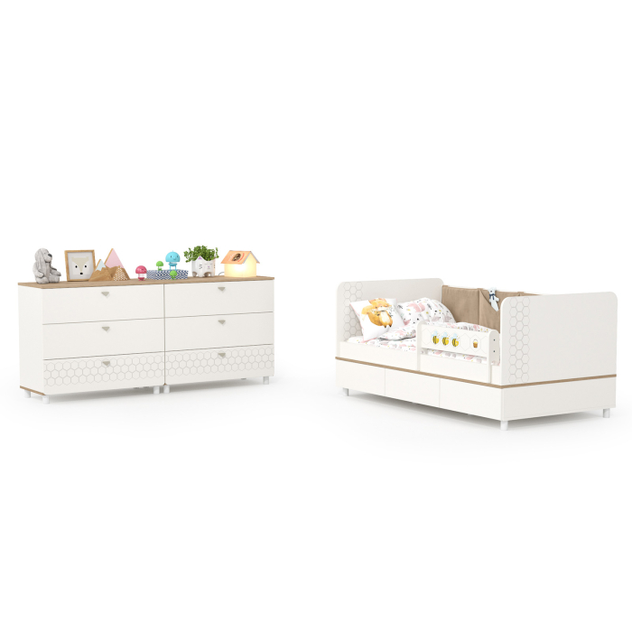 Односпальная кровать Эйп оснащена съёмным мягким элементом с карманами — можно легко снять для стирки. Съёмный бортик на кроватке — это надежная защита от беспокойного сна Вашего малыша. Оригинальная фотопечать - мультяшные пчёлки, которые никого не оставят равнодушным. Спальное место 800х1600 мм., основание под матрас в комплекте (настил ЛДСП). Матрас для этой кровати приобретается отдельно. Рекомендуемая высота матраса 120 мм. В основании кроватки размещены - три выкатных ящика для постельных принадлежностей и личных вещей ребёнка. Cистема хранения комодов предствлена шестью выдвижными ящиками на шариковых направляющих полного выдвижения. Конструктивно это два комода Эйп 13.322 объединенных в единый блок. На фасаде скандинавские геометрические мотивы универсального цветового решения делают эту мебель подходящей и девочкам, и мальчикам. Опоры - регулируемые, что позволяет легко компенсировать неровности пола. Изготовлена мебель из экологически чистой ламинированной ДСП 16 мм, торцы окромлены ПХВ плёнкой. Толстая кромка — все выступающие части кровати закрыты прочной и безопасной кромкой толщиной 2 мм. Лицевая фурнитура - минималистичные пластиковые ручки. В производстве использованы качественные материалы и фурнитура - можно разрабатывать проект на весь период обучения. Выдвижные ящики на шариковых направляющих полного выдвижения обеспечивают длительную и тихую эксплуатацию. Распашные двери на четырёхшарнирных петлях без доводчиков. Поставляется в разобранном виде в надёжной упаковке, с комплектом сборочной фурнитуры и инструкцией по сборке. Изображения кровати в детскую Эйп с комодами на три ящика Вы можете найти выше в начале страницы.