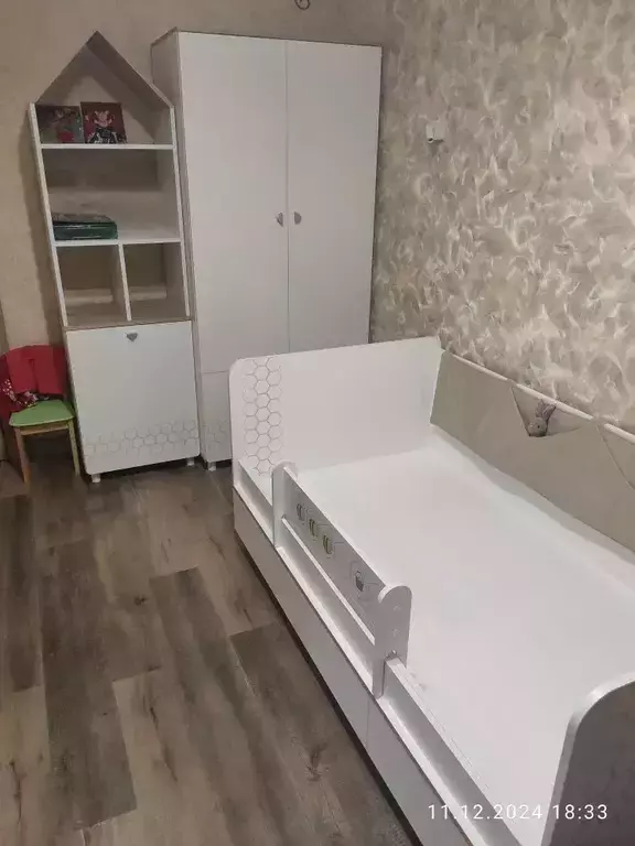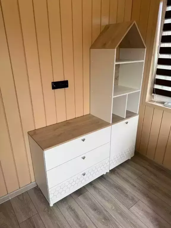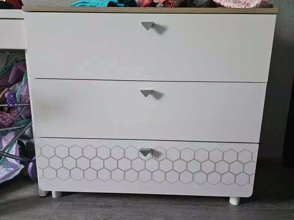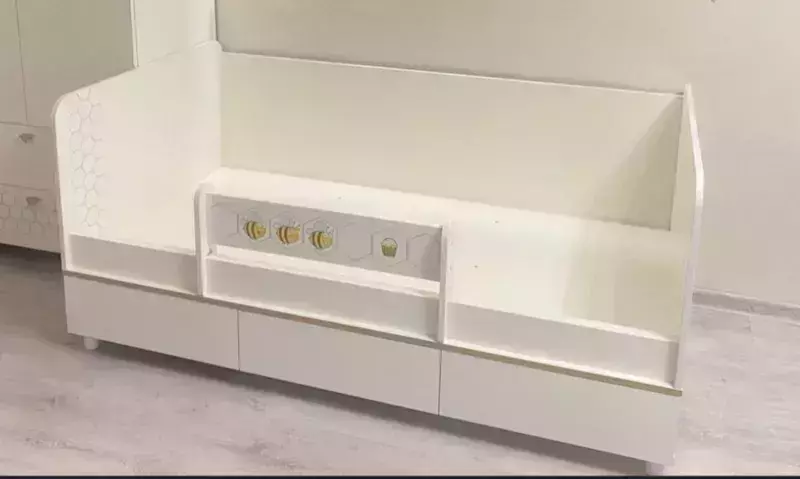 Мебель для детской комнаты состоит из двух кроваток, шкафа для одежды, стеллажа и комода. Каждая односпальная кровать Эйп оснащена съёмным мягким элементом с карманами — можно легко снять для стирки. Съёмный бортик на кроватке — это надежная защита от беспокойного сна Вашего малыша. Оригинальная фотопечать - мультяшные пчёлки, которые никого не оставят равнодушным. Спальное место 800х1600 мм., основание под матрас в комплекте (настил ЛДСП). Матрас для этой кровати приобретается отдельно. Рекомендуемая высота матраса 120 мм. В основании кроватки размещены - три выкатных ящика для постельных принадлежностей и личных вещей ребёнка. За распашными дверками шкафа расположено отделение со штангой для одежды на плечиках и отделение с тремя полка. В нижней части расположено два выдвижных ящика на шариковых направляющих полного выдвижения, что значительно повышает функционал. Стеллаж конструктивно представляет 5 ярусов, нижние два за распашной дверкой. Верхняя часть стеллажа выполнена в виде крыши домика, что несомненно будет радовать малыша. Дверь при сборке можно установить на любую сторону. Cистема хранения комода предствлена тремя выдвижными ящиками на шариковых направляющих полного выдвижения. На фасаде скандинавские геометрические мотивы универсального цветового решения делают эту мебель подходящей и девочкам, и мальчикам. Опоры - регулируемые, что позволяет легко компенсировать неровности пола. Изготовлена мебель из экологически чистой ламинированной ДСП 16 мм, торцы окромлены ПХВ плёнкой. Толстая кромка — все выступающие части кровати закрыты прочной и безопасной кромкой толщиной 2 мм. Лицевая фурнитура - минималистичные пластиковые ручки. В производстве использованы качественные материалы и фурнитура - можно разрабатывать проект на весь период обучения. Выдвижные ящики на шариковых направляющих полного выдвижения обеспечивают длительную и тихую эксплуатацию. Распашные двери на четырёхшарнирных петлях без доводчиков. Поставляется в разобранном виде в надёжной упаковке, с комплектом сборочной фурнитуры и инструкцией по сборке. Изображения мебели для детской комнаты с кроватями для двоих детей Эйп Вы можете найти выше в начале страницы.