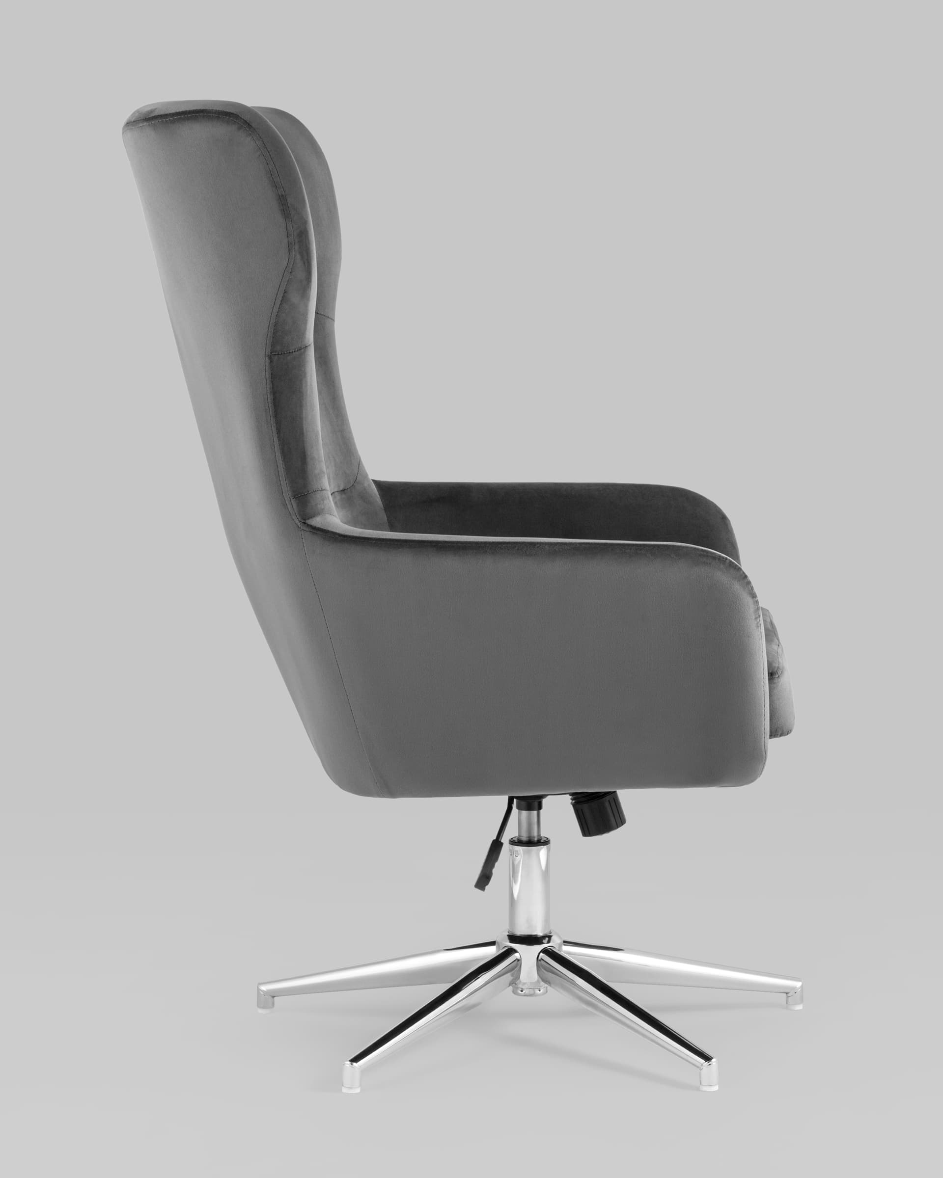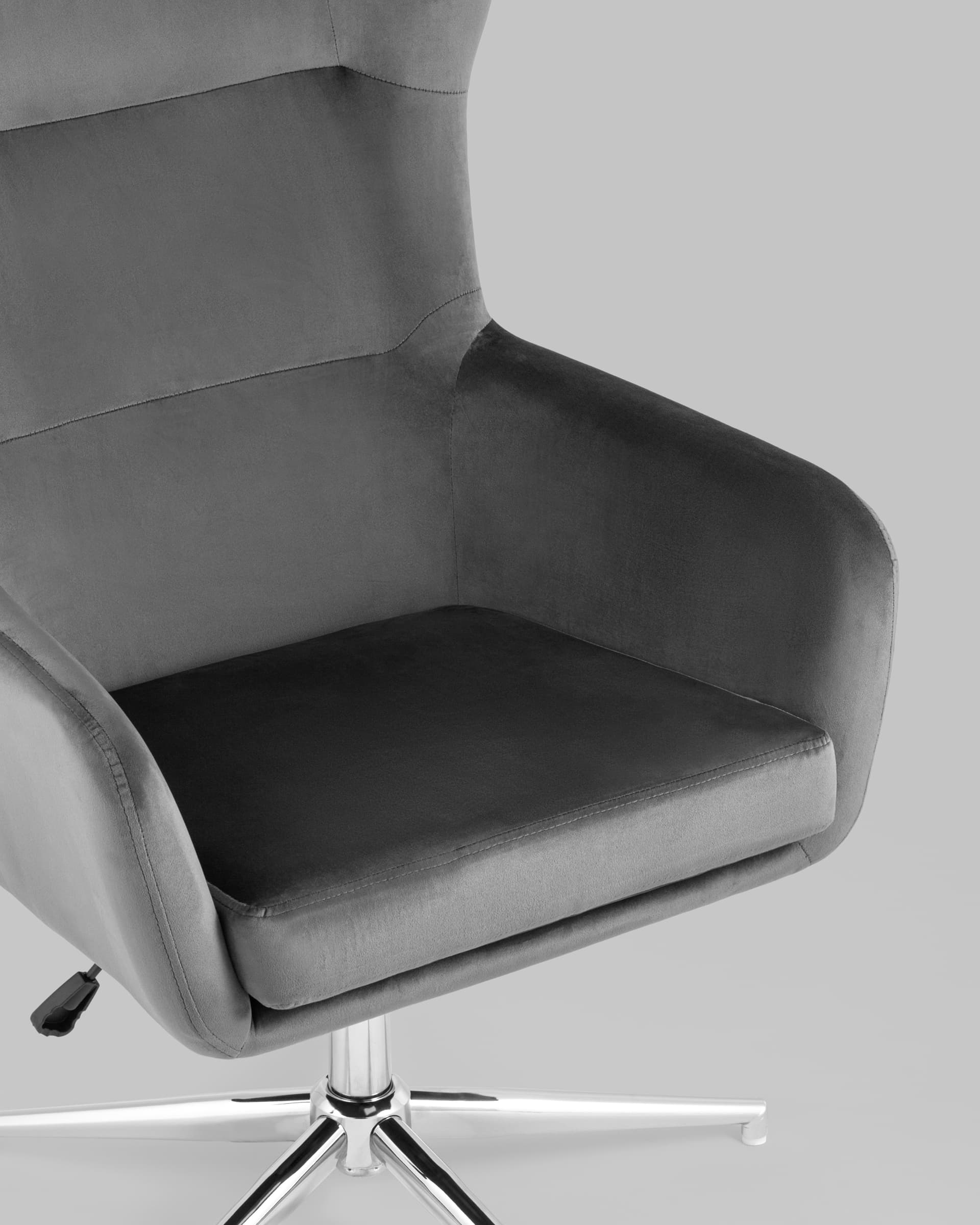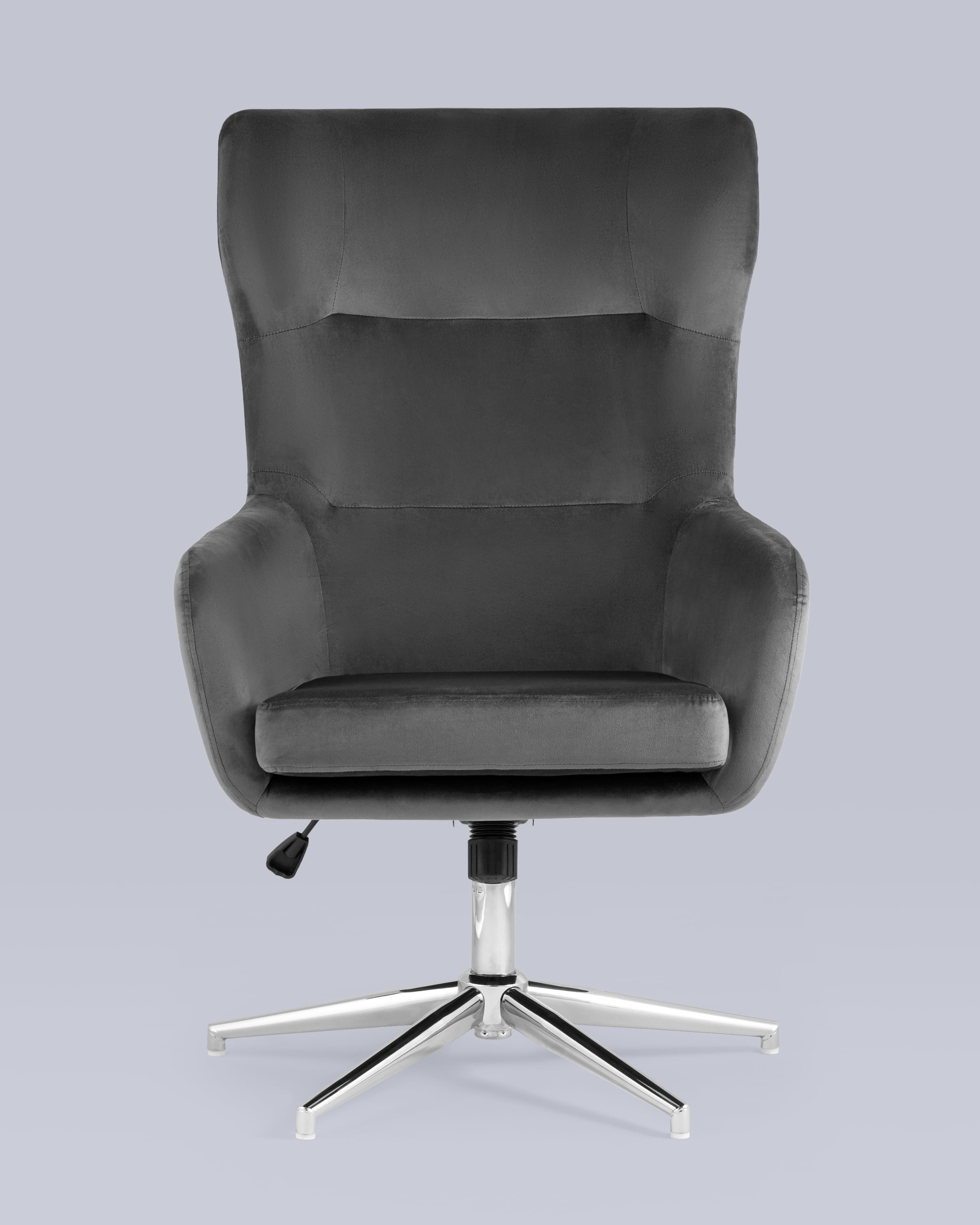 Широкое кресло с удобной высокой спинкой на крепком металлическом каркасе. Регулировка по высоте. Обивка выполнена из мягкого износостойкого велюра. Нагрузка до 120 кг. Высота сиденья регулируется от 48 до 58 см.