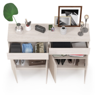 Состоит из двух комодов-тумб Ника 13.317.03 объединенных в единый блок. Каждый комод-тумба оборудована выдвижным ящиком и закрытой нишей с одной полкой за распашными дверками. Высота комода-тумбы позволяет использовать тумбу в качестве столика в тандеме с зеркалом в туалетном уголке или в прихожей. Лёгкий рисунок древесной структуры служит отличным дополнением к общему светлому тону. Распашные двери на четырёхшарнирных петлях без доводчиков. Ящики оснащены шариковыми направляющими полного выдвижения, которые обеспечивают их лёгкий ход и комфортное функционирование. Фасады без лицевой фурнитуры - открываются за край. Выполнена мебель из качественной, экологически чистой ламинированной ДСП 16 мм, популярного материала при производстве мебели. Поставляется в разобранном виде в надёжной упаковке, с комплектом сборочной фурнитуры и инструкцией по сборке.