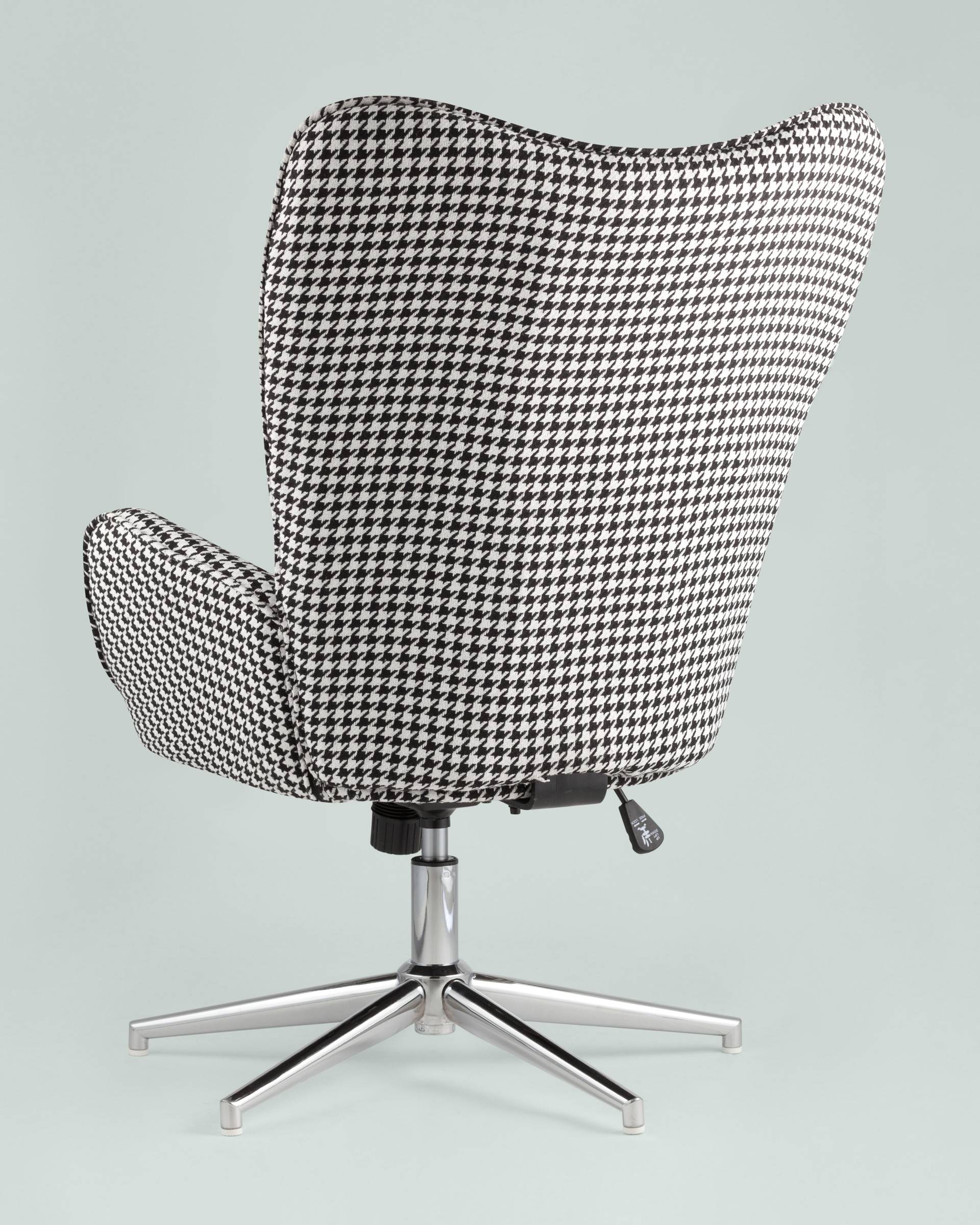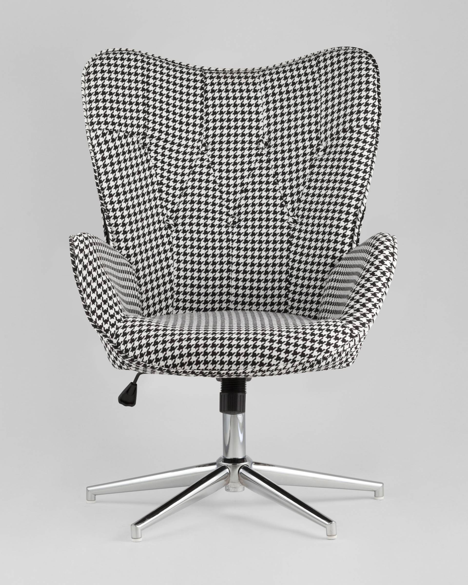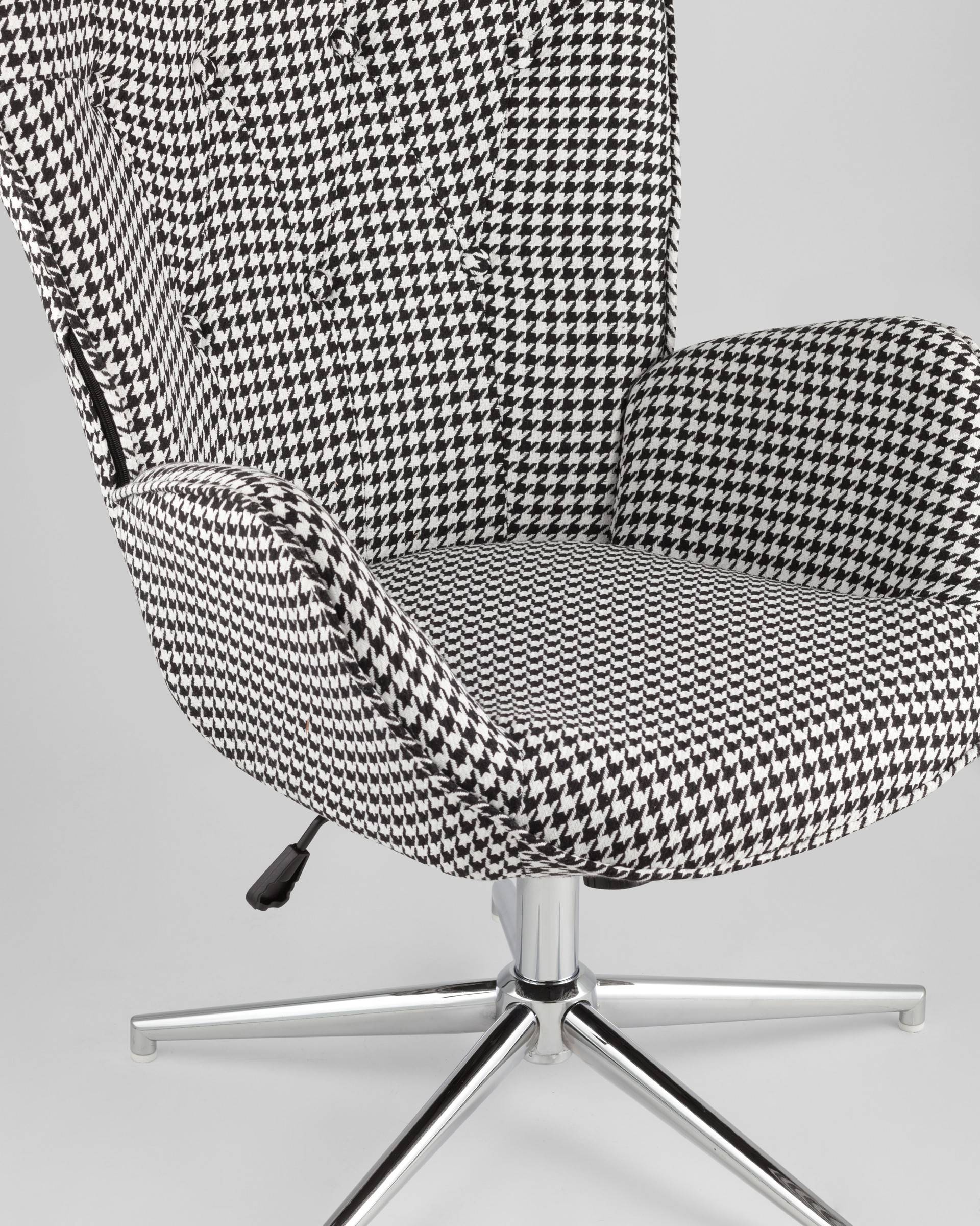 Мягкое сиденье с высокой поддерживающей спинкой анатомической формы подарит комфорт и уют. В качестве обивки используется прочная износостойкая ткань с точечным декором. Металлическая ножка регулируется по высоте и обеспечивает хорошую устойчивость. Удобные подлокотники добавят комфорта.