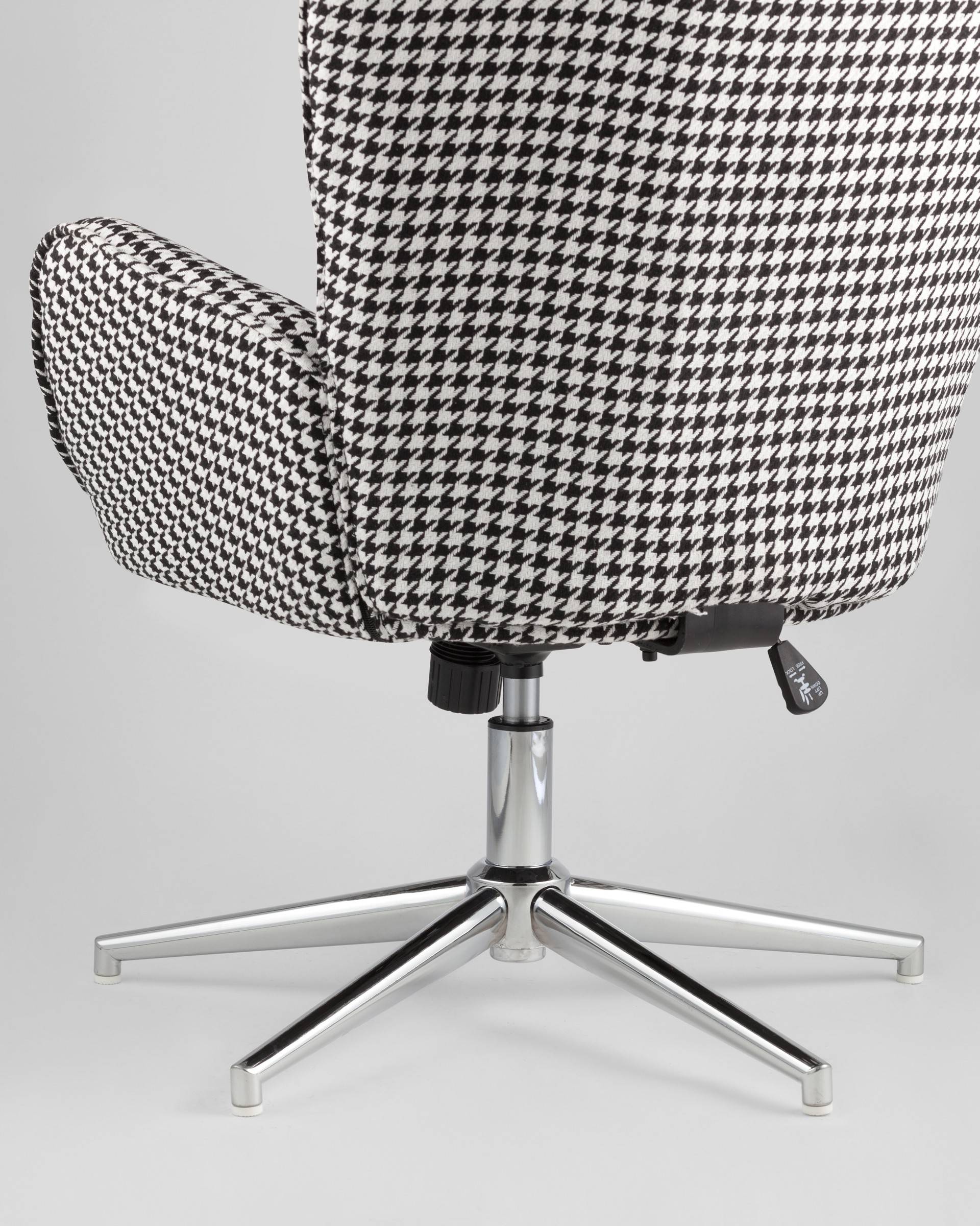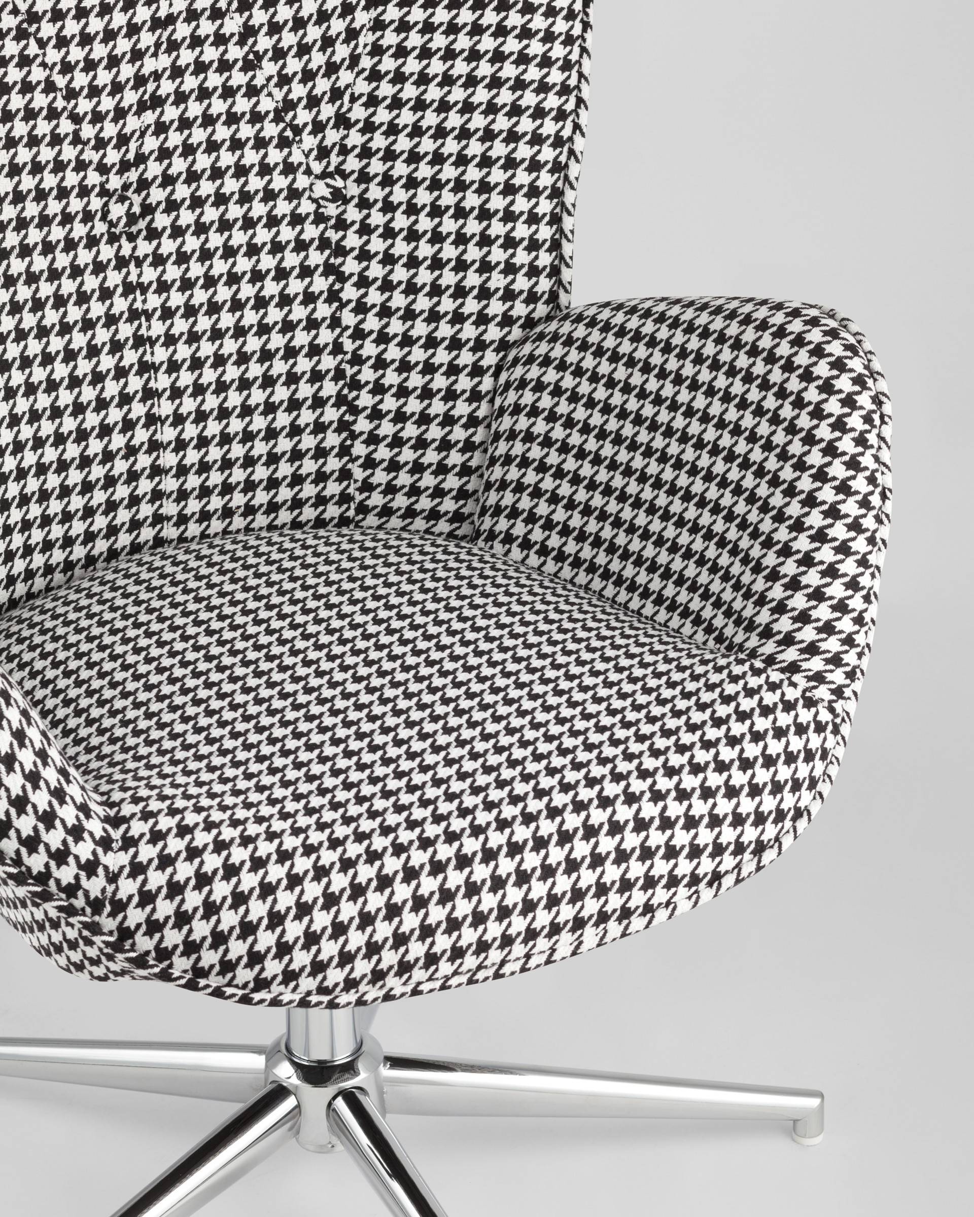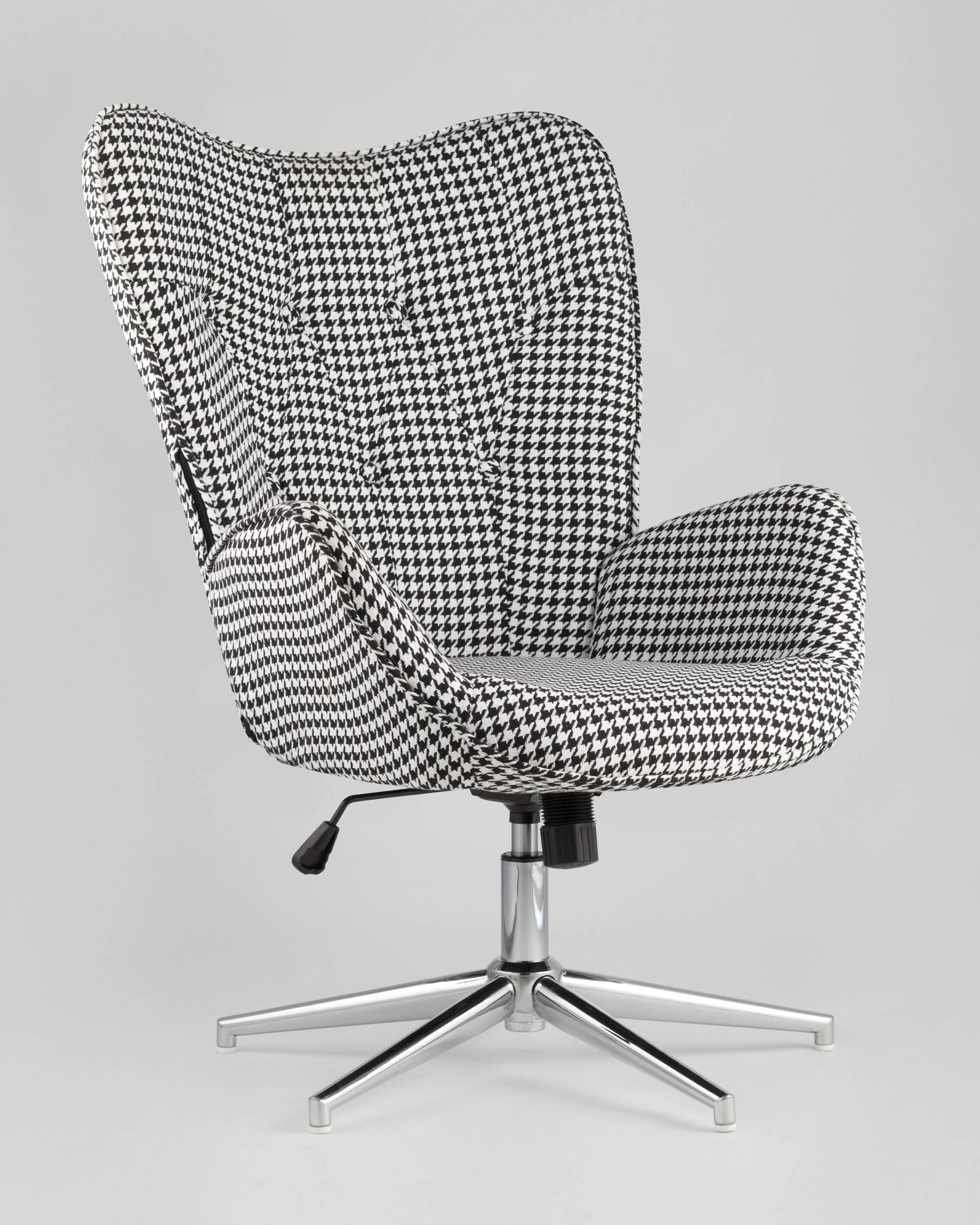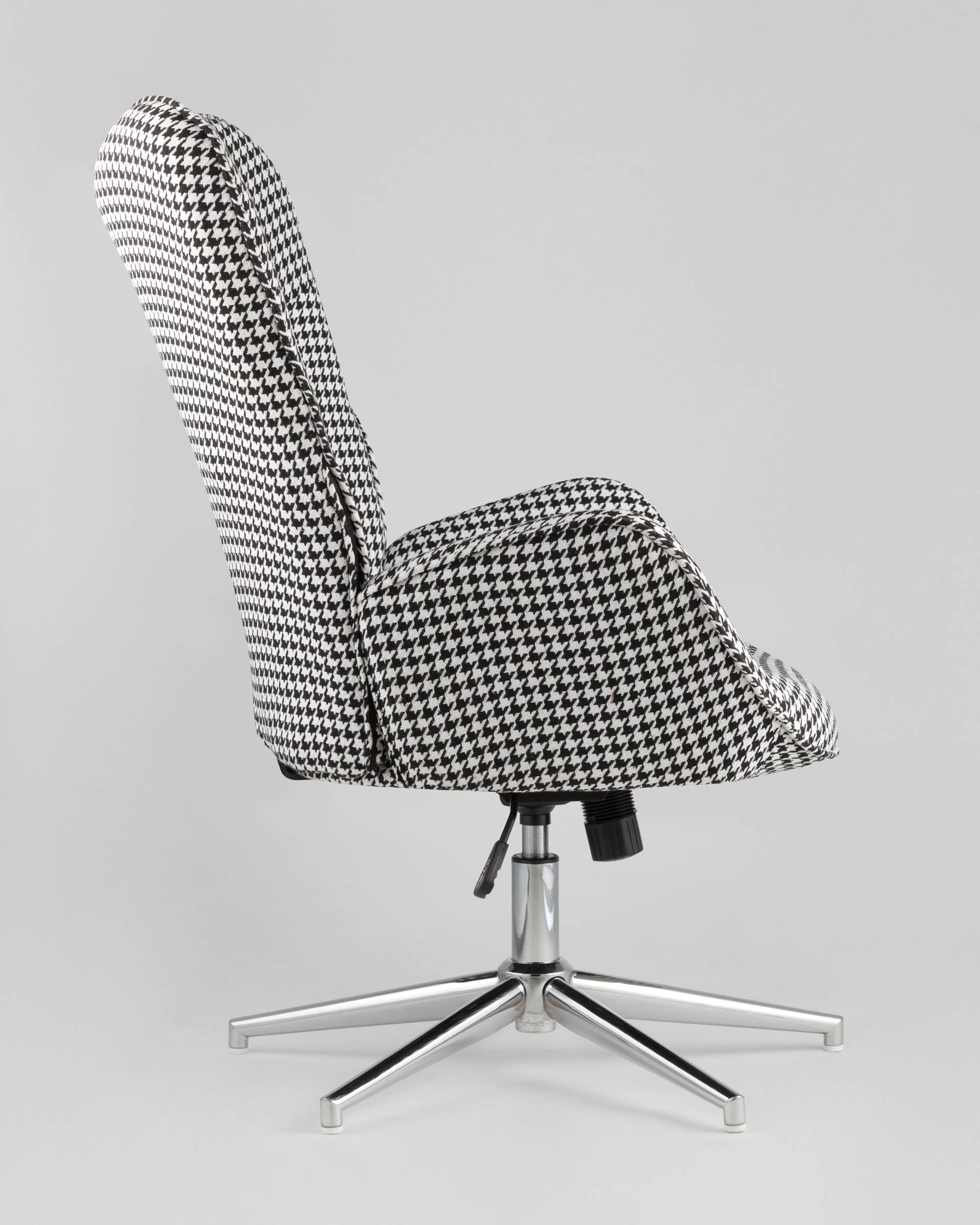 Мягкое сиденье с высокой поддерживающей спинкой анатомической формы подарит комфорт и уют. В качестве обивки используется прочная износостойкая ткань с точечным декором. Металлическая ножка регулируется по высоте и обеспечивает хорошую устойчивость. Удобные подлокотники добавят комфорта.