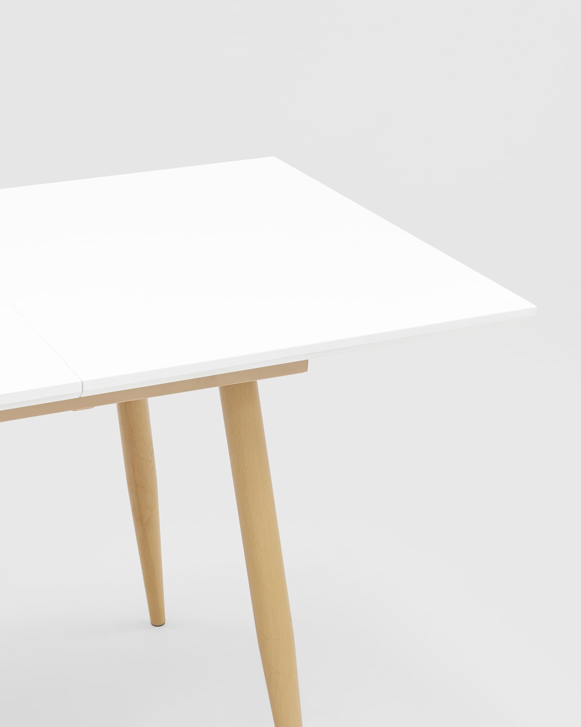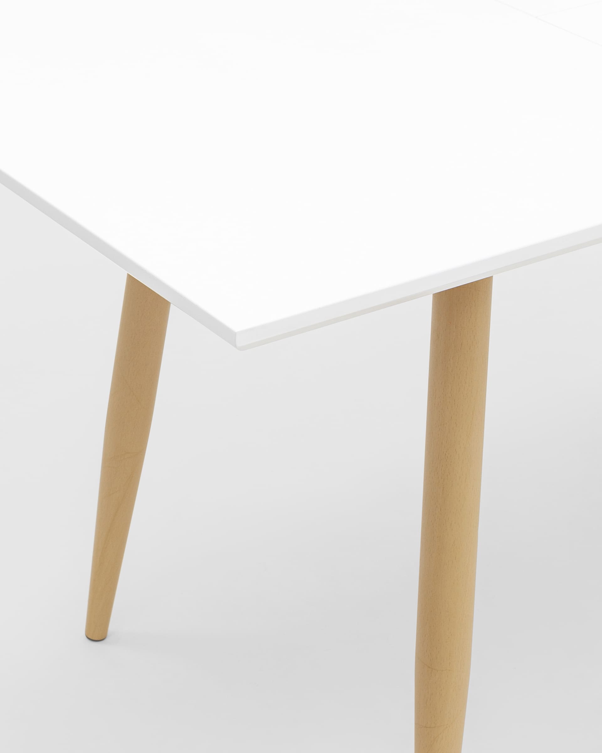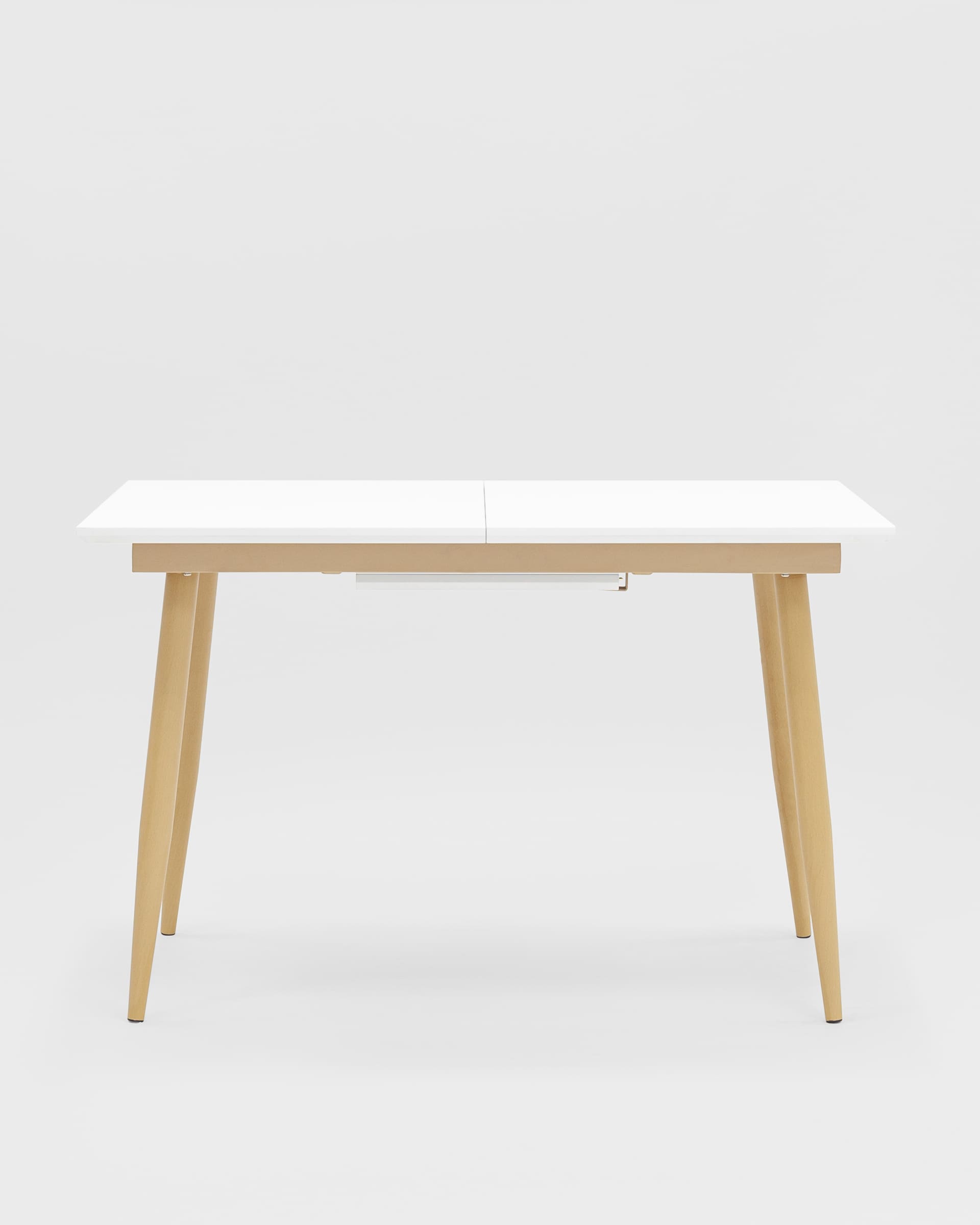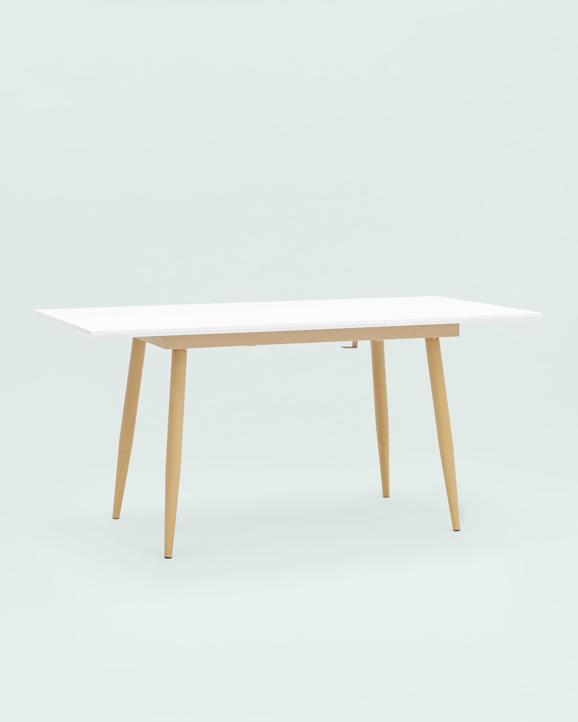 Обеденный стол в прямоугольной столешницей. Цвет столешницы белый. Ножки металлические, покрашены в цвет светлого дерева.
