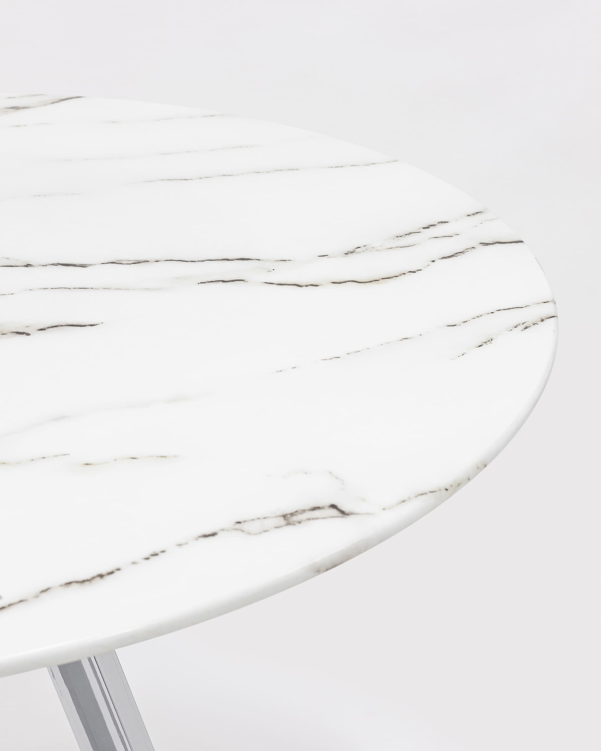 Обеденный стол с красивой стеклянной круглой столешницей белого цвета с рисунком под мрамор.
