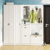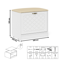 Компактная маленькая обувница без полок за откидной дверкой. За откидной дверцей достаточно места для нескольких пар обуви. Обувница оборудована мягким сиденьем - ее можно использовать в качестве банкетки с комфортом обуваясь перед выходом. Для фиксации откидного фасада используется газлифт мебельный. Максимальная нагрузка составляет 5 кг. Ручка в виде скобы выполнена из металла в цвете бронза. Декоративная фрезеровка Ромб служит отличным дополнением к общему светлому тону фасада. Дверь закреплена на четырёхшарнирных петлях. Фасад выполнен из МДФ односторонней белой 16 мм. и покрыта плёнкой ПВХ 0,3 мм. белое дерево. Корпус выполнен из ламинированной ДСП 16 мм., которая имеет гигиенический сертификат Е1 и относится к самой безопасной группе ДСП. Торцы деталей облицованы кромкой ПВХ 2 мм. и 0,4 мм., что улучшает эстетический вид и продлевает срок службы обувнице. Поставляется обувница с мягким сиденьем П-6 в разобранном виде в надёжной упаковке, с комплектом сборочной фурнитуры и инструкцией по сборке. Изображения обувницы с мягким сиденьем П-6 Вы можете найти выше в начале страницы.
