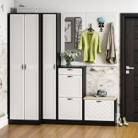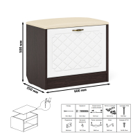 Компактная маленькая обувница без полок за откидной дверкой. За откидной дверцей достаточно места для нескольких пар обуви. Обувница оборудована мягким сиденьем - ее можно использовать в качестве банкетки с комфортом обуваясь перед выходом. Для фиксации откидного фасада используется газлифт мебельный. Максимальная нагрузка составляет 5 кг. Ручка в виде скобы выполнена из металла в цвете бронза. Декоративная фрезеровка Ромб служит отличным дополнением к общему светлому тону фасада. Дверь закреплена на четырёхшарнирных петлях. Фасад выполнен из МДФ односторонней белой 16 мм. и покрыта плёнкой ПВХ 0,3 мм. белое дерево. Корпус выполнен из ламинированной ДСП 16 мм., которая имеет гигиенический сертификат Е1 и относится к самой безопасной группе ДСП. Торцы деталей облицованы кромкой ПВХ 2 мм. и 0,4 мм., что улучшает эстетический вид и продлевает срок службы обувнице. Поставляется обувница с мягким сиденьем П-6 в разобранном виде в надёжной упаковке, с комплектом сборочной фурнитуры и инструкцией по сборке. Изображения обувницы с мягким сиденьем П-6 Вы можете найти выше в начале страницы.
