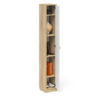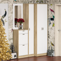 Классический узкий пенал, за распашной дверью которого расположены 4 полки. Сторону открывания двери Вы определяете при сборке, что расширяет возможности удобной меблировки прихожей. Декоративная фрезеровка Ромб служит отличным дополнением к общему светлому тону фасада. Дверь закреплена на четырёхшарнирных петлях. Фасад выполнен из МДФ односторонней белой 16 мм. и покрыта плёнкой ПВХ 0,3 мм. белое дерево. Корпус выполнен из ламинированной ДСП 16 мм., которая имеет гигиенический сертификат Е1 и относится к самой безопасной группе ДСП. Торцы деталей облицованы кромкой ПВХ 2 мм. и 0,4 мм., что улучшает эстетический вид и продлевает срок службы обувнице. На опорах мебели используются пластиковые подпятники, сохраняющие Ваше напольное покрытие от повреждений. Ручка в виде скобы выполнены из металла в цвете бронза. Поставляется пенал П-6 в разобранном виде в надёжной упаковке, с комплектом сборочной фурнитуры и инструкцией по сборке. Изображения пенала П-6 Вы можете найти выше в начале страницы.