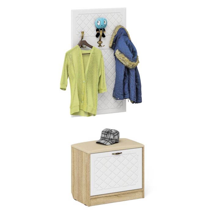 Отзывы о Столплит Обувница с мягким сиденьем с вешалкой для одежды П-6 МДФ фрезеровка ромб Белое дерево/дуб сонома