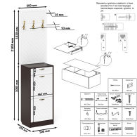 Комплектация состоит из обувницы и навесной вешалки. Компактная маленькая обувница без полок за откидной дверкой. За откидной дверцей достаточно места для нескольких пар обуви. Обувница оборудована мягким сиденьем - ее можно использовать в качестве банкетки с комфортом обуваясь перед выходом. Для фиксации откидного фасада используется газлифт мебельный. Максимальная нагрузка составляет 5 кг. Ручка в виде скобы выполнена из металла в цвете бронза. Классическая прямоугольная настенная вешалка с крючками. Оборудована тремя трехрожковыми крючками для одежды. Глубина вешалки - 16 мм., 9,3 см.- это глубина с учетом крючков. Крепления вешалки к стене в комплектацию не входит. Двери закреплены на четырёхшарнирных петлях. Фасад и панель выполнены из МДФ односторонней белой 16 мм. и покрыта плёнкой ПВХ 0,3 мм. белое дерево. Декоративная фрезеровка Ромб служит отличным дополнением к общему светлому тону фасада. Корпус выполнен из ламинированной ДСП 16 мм., которая имеет гигиенический сертификат Е1 и относится к самой безопасной группе ДСП. Торцы деталей облицованы кромкой ПВХ 2 мм. и 0,4 мм., что улучшает эстетический вид и продлевает срок службы обувнице. На опорах мебели используются пластиковые подпятники, сохраняющие Ваше напольное покрытие от повреждений. Поставляется обувница с мягким сиденьем с вешалкой для одежды П-6 в разобранном виде в надёжной упаковке, с комплектом сборочной фурнитуры и инструкцией по сборке. Изображения обувницы с мягким сиденьем с вешалкой для одежды П-6 Вы можете найти выше в начале страницы.