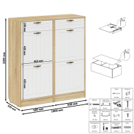 Конструктивно это две высокие тумбы П-6 Об, объединенных в единый блок. Каждая тумба для обуви оборудована ящиком для мелочей сверцу и двумя отделениями с откидными фасадами для обуви. Для фиксации откидных фасадов используется газлифт мебельный. Максимальная нагрузка составляет 5 кг. Ручки в виде скоб выполнены из металла в цвете бронза. Декоративная фрезеровка Прованс служит отличным дополнением к общему светлому тону фасада. Выдвижные ящики установлены на металлические направляющие, обеспечивающие надёжное прямолинейное движение. Двери закреплены на четырёхшарнирных петлях. Фасады выполнены из МДФ односторонней белой 16 мм. и покрыта плёнкой ПВХ 0,3 мм. белое дерево. Корпуса выполнены из ламинированной ДСП 16 мм., которая имеет гигиенический сертификат Е1 и относится к самой безопасной группе ДСП. Торцы деталей облицованы кромкой ПВХ 2 мм. и 0,4 мм., что улучшает эстетический вид и продлевает срок службы обувнице. На опорах мебели используются пластиковые подпятники, сохраняющие Ваше напольное покрытие от повреждений. Поставляются две тумбы для обуви 2 секции с выдвижным ящиком в разобранном виде в надёжной упаковке, с комплектом сборочной фурнитуры и инструкцией по сборке. Изображения двух тумб для обуви 2 секции с выдвижным ящиком Вы можете найти выше в начале страницы.