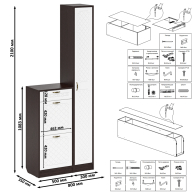 Комплектация состоит из тумбы для обуви и пенала. Классический узкий пенал, за распашной дверью которого расположены 4 полки. Сторону открывания двери Вы определяете при сборке, что расширяет возможности удобной меблировки прихожей. Высокая обувница оборудована ящиком для мелочей сверцу и двумя отделениями с откидными фасадами для обуви. Для фиксации откидных фасадов используется газлифт мебельный. Максимальная нагрузка составляет 5 кг. Ручки в виде скоб выполнены из металла в цвете бронза. Декоративная фрезеровка Ромб служит отличным дополнением к общему светлому тону фасада. Выдвижной ящик установлен на металлические направляющие, обеспечивающие надёжное прямолинейное движение. Двери закреплены на четырёхшарнирных петлях. Фасады выполнены из МДФ односторонней белой 16 мм. и покрыта плёнкой ПВХ 0,3 мм. белое дерево. Корпуса выполнены из ламинированной ДСП 16 мм., которая имеет гигиенический сертификат Е1 и относится к самой безопасной группе ДСП. Торцы деталей облицованы кромкой ПВХ 2 мм. и 0,4 мм., что улучшает эстетический вид и продлевает срок службы обувнице. На опорах мебели используются пластиковые подпятники, сохраняющие Ваше напольное покрытие от повреждений. Поставляются тумба для обуви в прихожую с пеналом П-6 в разобранном виде в надёжной упаковке, с комплектом сборочной фурнитуры и инструкцией по сборке. Изображения тумбы для обуви в прихожую с пеналом П-6 Вы можете найти выше в начале страницы.
