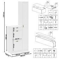 Комплектация состоит из тумбы для обуви и пенала. Классический узкий пенал, за распашной дверью которого расположены 4 полки. Сторону открывания двери Вы определяете при сборке, что расширяет возможности удобной меблировки прихожей. Высокая обувница оборудована ящиком для мелочей сверцу и двумя отделениями с откидными фасадами для обуви. Для фиксации откидных фасадов используется газлифт мебельный. Максимальная нагрузка составляет 5 кг. Ручки в виде скоб выполнены из металла в цвете бронза. Декоративная фрезеровка Прованс служит отличным дополнением к общему светлому тону фасада. Выдвижной ящик установлен на металлические направляющие, обеспечивающие надёжное прямолинейное движение. Двери закреплены на четырёхшарнирных петлях. Фасады выполнены из МДФ односторонней белой 16 мм. и покрыта плёнкой ПВХ 0,3 мм. белое дерево. Корпуса выполнены из ламинированной ДСП 16 мм., которая имеет гигиенический сертификат Е1 и относится к самой безопасной группе ДСП. Торцы деталей облицованы кромкой ПВХ 2 мм. и 0,4 мм., что улучшает эстетический вид и продлевает срок службы обувнице. На опорах мебели используются пластиковые подпятники, сохраняющие Ваше напольное покрытие от повреждений. Поставляются тумба для обуви в прихожую с пеналом П-6 в разобранном виде в надёжной упаковке, с комплектом сборочной фурнитуры и инструкцией по сборке. Изображения тумбы для обуви в прихожую с пеналом П-6 Вы можете найти выше в начале страницы.