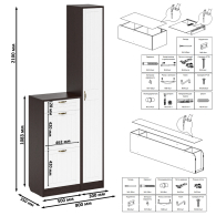 Комплектация состоит из тумбы для обуви и пенала. Классический узкий пенал, за распашной дверью которого расположены 4 полки. Сторону открывания двери Вы определяете при сборке, что расширяет возможности удобной меблировки прихожей. Высокая обувница оборудована ящиком для мелочей сверцу и двумя отделениями с откидными фасадами для обуви. Для фиксации откидных фасадов используется газлифт мебельный. Максимальная нагрузка составляет 5 кг. Ручки в виде скоб выполнены из металла в цвете бронза. Декоративная фрезеровка Прованс служит отличным дополнением к общему светлому тону фасада. Выдвижной ящик установлен на металлические направляющие, обеспечивающие надёжное прямолинейное движение. Двери закреплены на четырёхшарнирных петлях. Фасады выполнены из МДФ односторонней белой 16 мм. и покрыта плёнкой ПВХ 0,3 мм. белое дерево. Корпуса выполнены из ламинированной ДСП 16 мм., которая имеет гигиенический сертификат Е1 и относится к самой безопасной группе ДСП. Торцы деталей облицованы кромкой ПВХ 2 мм. и 0,4 мм., что улучшает эстетический вид и продлевает срок службы обувнице. На опорах мебели используются пластиковые подпятники, сохраняющие Ваше напольное покрытие от повреждений. Поставляются тумба для обуви в прихожую с пеналом П-6 в разобранном виде в надёжной упаковке, с комплектом сборочной фурнитуры и инструкцией по сборке. Изображения тумбы для обуви в прихожую с пеналом П-6 Вы можете найти выше в начале страницы.