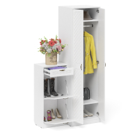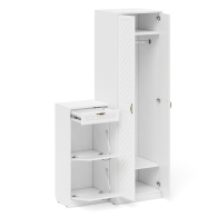Комплектация состоит из шкафа для одежды и высокой тумбы для обуви. Классический шкаф за распашными дверками которого расположены антресольная полка для головных уборов, горизонтальная штанга и нижняя ниша для обуви. Высокая обувница оборудована ящиком для мелочей сверху и двумя отделениями с откидными фасадами для обуви. Для фиксации откидных фасадов используется газлифт мебельный. Максимальная нагрузка составляет 5 кг. Ручки в виде скоб выполнены из металла в цвете бронза. Выдвижной ящик установлен на металлические направляющие, обеспечивающие надёжное прямолинейное движение. Двери закреплены на четырёхшарнирных петлях. Фасады выполнены из МДФ односторонней белой 16 мм. и покрыта плёнкой ПВХ 0,3 мм. белое дерево. Декоративная фрезеровка Ромб служит отличным дополнением к общему светлому тону фасада. Корпуса выполнены из ламинированной ДСП 16 мм., которая имеет гигиенический сертификат Е1 и относится к самой безопасной группе ДСП. Торцы деталей облицованы кромкой ПВХ 2 мм. и 0,4 мм., что улучшает эстетический вид и продлевает срок службы обувнице. На опорах мебели используются пластиковые подпятники, сохраняющие Ваше напольное покрытие от повреждений. Поставляются шкаф с тумбой для обуви 2 секции П-6 № 16 в разобранном виде в надёжной упаковке, с комплектом сборочной фурнитуры и инструкцией по сборке. Изображения шкафа с тумбой для обуви 2 секции П-6 № 16 Вы можете найти выше в начале страницы.