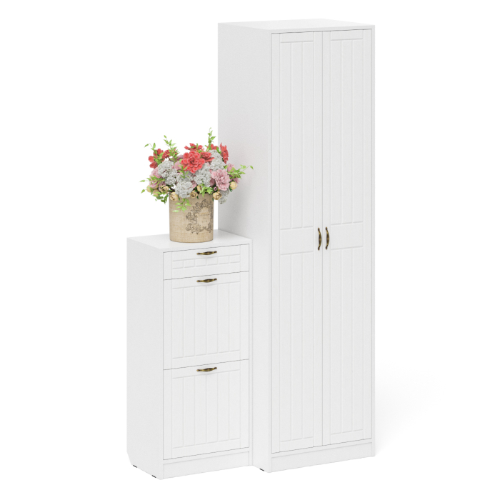 Комплектация состоит из шкафа для одежды и высокой тумбы для обуви. Классический шкаф за распашными дверками которого расположены антресольная полка для головных уборов, горизонтальная штанга и нижняя ниша для обуви. Высокая обувница оборудована ящиком для мелочей сверху и двумя отделениями с откидными фасадами для обуви. Для фиксации откидных фасадов используется газлифт мебельный. Максимальная нагрузка составляет 5 кг. Ручки в виде скоб выполнены из металла в цвете бронза. Выдвижной ящик установлен на металлические направляющие, обеспечивающие надёжное прямолинейное движение. Двери закреплены на четырёхшарнирных петлях. Фасады выполнены из МДФ односторонней белой 16 мм. и покрыта плёнкой ПВХ 0,3 мм. белое дерево. Декоративная фрезеровка Прованс служит отличным дополнением к общему светлому тону фасада. Корпуса выполнены из ламинированной ДСП 16 мм., которая имеет гигиенический сертификат Е1 и относится к самой безопасной группе ДСП. Торцы деталей облицованы кромкой ПВХ 2 мм. и 0,4 мм., что улучшает эстетический вид и продлевает срок службы обувнице. На опорах мебели используются пластиковые подпятники, сохраняющие Ваше напольное покрытие от повреждений. Поставляются шкаф с тумбой для обуви 2 секции П-6 № 16 в разобранном виде в надёжной упаковке, с комплектом сборочной фурнитуры и инструкцией по сборке. Изображения шкафа с тумбой для обуви 2 секции П-6 № 16 Вы можете найти выше в начале страницы.