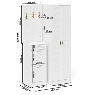 Комплектация состоит из шкафа для одежды, высокой обувницы и навесной вешалки. Классический шкаф за распашными дверками которого расположены антресольная полка для головных уборов, горизонтальная штанга и нижняя ниша для обуви. Высокая обувница оборудована ящиком для мелочей сверху и двумя отделениями с откидными фасадами для обуви. Для фиксации откидного фасада используется газлифт мебельный. Максимальная нагрузка составляет 5 кг. Классическая прямоугольная настенная вешалка с крючками. Оборудована тремя трехрожковыми крючками для одежды. Глубина вешалки - 16 мм., 9,3 см.- это глубина с учетом крючков. Крепления вешалки к стене в комплектацию не входит. Ручки в виде скоб выполнены из металла в цвете бронза. Выдвижной ящик установлен на металлические направляющие, обеспечивающие надёжное прямолинейное движение. Двери закреплены на четырёхшарнирных петлях. Фасады выполнены из МДФ односторонней белой 16 мм. и покрыта плёнкой ПВХ 0,3 мм. белое дерево. Декоративная фрезеровка Ромб служит отличным дополнением к общему светлому тону фасада. Корпуса выполнены из ламинированной ДСП 16 мм., которая имеет гигиенический сертификат Е1 и относится к самой безопасной группе ДСП. Торцы деталей облицованы кромкой ПВХ 2 мм. и 0,4 мм., что улучшает эстетический вид и продлевает срок службы обувнице. На опорах мебели используются пластиковые подпятники, сохраняющие Ваше напольное покрытие от повреждений. Поставляются вешалка с крючками с обувницей с ящиком и шкаф П-6 № 18 в разобранном виде в надёжной упаковке, с комплектом сборочной фурнитуры и инструкцией по сборке. Изображения вешалки с крючками с обувницей с ящиком и шкафом П-6 № 18 Вы можете найти выше в начале страницы.