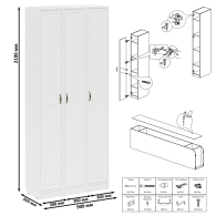 Комплектация состоит из трех узких пеналов объединненых в единый блок. Классический узкий пенал, за распашной дверью которого расположены 4 полки. В комплектации три пенала. Сторону открывания дверей Вы определяете при сборке, что расширяет возможности удобной меблировки прихожей. Ручки в виде скоб выполнены из металла в цвете бронза. Декоративная фрезеровка Прованс служит отличным дополнением к общему светлому тону фасада. Выдвижные ящики установлены на металлические направляющие, обеспечивающие надёжное прямолинейное движение. Двери закреплены на четырёхшарнирных петлях. Фасады выполнены из МДФ односторонней белой 16 мм. и покрыта плёнкой ПВХ 0,3 мм. белое дерево. Корпуса выполнены из ламинированной ДСП 16 мм., которая имеет гигиенический сертификат Е1 и относится к самой безопасной группе ДСП. Торцы деталей облицованы кромкой ПВХ 2 мм. и 0,4 мм., что улучшает эстетический вид и продлевает срок службы обувнице. На опорах мебели используются пластиковые подпятники, сохраняющие Ваше напольное покрытие от повреждений. Поставляются три пенала в прихожую П-6 в разобранном виде в надёжной упаковке, с комплектом сборочной фурнитуры и инструкцией по сборке. Изображения трех пеналов в прихожую П-6 Вы можете найти выше в начале страницы.