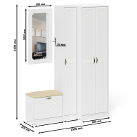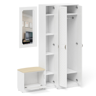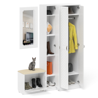 Комплектация состоит из шкафа для одежды и пенала объединенных в единый блок, тумбы с сиденьем и навесного зеркала. Классический шкаф за распашными дверками которого расположены антресольная полка для головных уборов, горизонтальная штанга и нижняя ниша для обуви. Классический узкий пенал, за распашной дверью которого расположены 4 полки. Сторону открывания двери Вы определяете при сборке, что расширяет возможности удобной меблировки прихожей. Компактная маленькая обувница без полок за откидной дверкой. За откидной дверцей достаточно места для нескольких пар обуви. Обувница оборудована мягким сиденьем - ее можно использовать в качестве банкетки с комфортом обуваясь перед выходом. Для фиксации откидных фасадов используется газлифт мебельный. Максимальная нагрузка составляет 5 кг. Зеркало в раме из МДФ. Крепления вешалки и зеркала к стене в комплектацию не входит. Ручки в виде скоб выполнены из металла в цвете бронза. Двери закреплены на четырёхшарнирных петлях. Фасады выполнены из МДФ односторонней белой 16 мм. и покрыта плёнкой ПВХ 0,3 мм. белое дерево. Декоративная фрезеровка Ромб служит отличным дополнением к общему светлому тону фасада. Корпуса выполнены из ламинированной ДСП 16 мм., которая имеет гигиенический сертификат Е1 и относится к самой безопасной группе ДСП. Торцы деталей облицованы кромкой ПВХ 2 мм. и 0,4 мм., что улучшает эстетический вид и продлевает срок службы обувнице. На опорах мебели используются пластиковые подпятники, сохраняющие Ваше напольное покрытие от повреждений. Поставляются тумба для обуви с сидением с зеркалом и пенал со шкафом П-6 № 26 в разобранном виде в надёжной упаковке, с комплектом сборочной фурнитуры и инструкцией по сборке. Изображения тумбы для обуви с сидением с зеркалом и пенала со шкафом П-6 № 26 Вы можете найти выше в начале страницы.