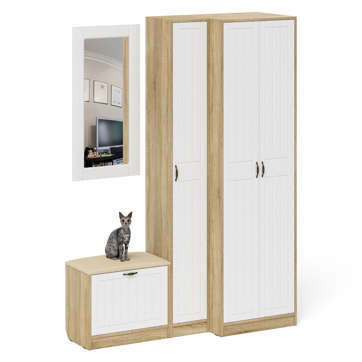 Отзывы о Столплит Тумба для обуви с сидением с зеркалом и пенал со шкафом П-6 № 26 МДФ фрезеровка прованс Белое дерево/дуб сонома