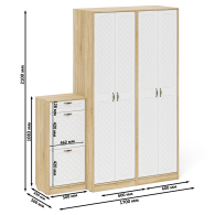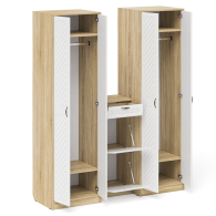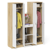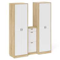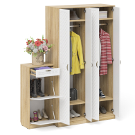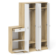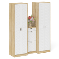 Комплектация состоит из двух шкафов для одежды объединенных в единый блок и высокой обувницы. Классический шкаф (в комплектации 2 единицы) за распашными дверками которого расположены антресольная полка для головных уборов, горизонтальная штанга и нижняя ниша для обуви. Высокая обувница оборудована ящиком для мелочей сверху и двумя отделениями с откидными фасадами для обуви. Для фиксации откидных фасадов используется газлифт мебельный. Максимальная нагрузка составляет 5 кг. Ручки в виде скоб выполнены из металла в цвете бронза. Выдвижной ящик установлен на металлические направляющие, обеспечивающие надёжное прямолинейное движение. Двери закреплены на четырёхшарнирных петлях. Фасады выполнены из МДФ односторонней белой 16 мм. и покрыта плёнкой ПВХ 0,3 мм. белое дерево. Декоративная фрезеровка Ромб служит отличным дополнением к общему светлому тону фасада. Корпуса выполнены из ламинированной ДСП 16 мм., которая имеет гигиенический сертификат Е1 и относится к самой безопасной группе ДСП. Торцы деталей облицованы кромкой ПВХ 2 мм. и 0,4 мм., что улучшает эстетический вид и продлевает срок службы обувнице. На опорах мебели используются пластиковые подпятники, сохраняющие Ваше напольное покрытие от повреждений. Поставляются тумба для обуви две секции и два шкафа в прихожую П-6 № 13 в разобранном виде в надёжной упаковке, с комплектом сборочной фурнитуры и инструкцией по сборке. Изображения тумбы для обуви две секции и двух шкафов в прихожую П-6 № 13 Вы можете найти выше в начале страницы.