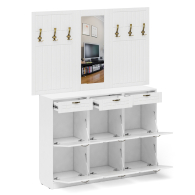 Комплектация состоит из трех высоких обувниц, двух навесных вешалок и зеркала. Высокая обувница (3 единицы в комплекте) оборудована ящиком для мелочей сверху и двумя отделениями с откидными фасадами для обуви. Классическая прямоугольная настенная вешалка с крючками (2 единицы в комплекте). Оборудована тремя трехрожковыми крючками для одежды. Глубина вешалки - 16 мм., 9,3 см.- это глубина с учетом крючков. Зеркало в раме из МДФ. Крепления вешалки и зеркала к стене в комплектацию не входит. Ручки в виде скоб выполнены из металла в цвете бронза. Выдвижные ящики установлены на металлические направляющие, обеспечивающие надёжное прямолинейное движение. Двери закреплены на четырёхшарнирных петлях. Фасады выполнены из МДФ односторонней белой 16 мм. и покрыта плёнкой ПВХ 0,3 мм. белое дерево. Декоративная фрезеровка Прованс служит отличным дополнением к общему светлому тону фасада. Корпуса выполнены из ламинированной ДСП 16 мм., которая имеет гигиенический сертификат Е1 и относится к самой безопасной группе ДСП. Торцы деталей облицованы кромкой ПВХ 2 мм. и 0,4 мм., что улучшает эстетический вид и продлевает срок службы обувнице. На опорах мебели используются пластиковые подпятники, сохраняющие Ваше напольное покрытие от повреждений. Поставляется прихожая П-6 № 6 в разобранном виде в надёжной упаковке, с комплектом сборочной фурнитуры и инструкцией по сборке. Изображения прихожей П-6 № 6 Вы можете найти выше в начале страницы.