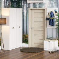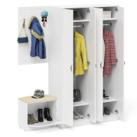 Комплектация состоит из двух шкафов для одежды объединенных в единый блок, тумбы с сиденьем и навесной вешалки. Классический шкаф (в комплектации 2 единицы) за распашными дверками которого расположены антресольная полка для головных уборов, горизонтальная штанга и нижняя ниша для обуви. Компактная маленькая обувница без полок за откидной дверкой. За откидной дверцей достаточно места для нескольких пар обуви. Обувница оборудована мягким сиденьем - ее можно использовать в качестве банкетки с комфортом обуваясь перед выходом. Для фиксации откидных фасадов используется газлифт мебельный. Максимальная нагрузка составляет 5 кг. Классическая прямоугольная настенная вешалка с крючками. Оборудована тремя трехрожковыми крючками для одежды. Глубина вешалки - 16 мм., 9,3 см.- это глубина с учетом крючков. Крепления вешалки к стене в комплектацию не входит. Ручки в виде скоб выполнены из металла в цвете бронза. Двери закреплены на четырёхшарнирных петлях. Фасады выполнены из МДФ односторонней белой 16 мм. и покрыта плёнкой ПВХ 0,3 мм. белое дерево. Декоративная фрезеровка Прованс служит отличным дополнением к общему светлому тону фасада. Корпуса выполнены из ламинированной ДСП 16 мм., которая имеет гигиенический сертификат Е1 и относится к самой безопасной группе ДСП. Торцы деталей облицованы кромкой ПВХ 2 мм. и 0,4 мм., что улучшает эстетический вид и продлевает срок службы обувнице. На опорах мебели используются пластиковые подпятники, сохраняющие Ваше напольное покрытие от повреждений. Поставляется модульная мебель для прихожей П-6 № 9 в разобранном виде в надёжной упаковке, с комплектом сборочной фурнитуры и инструкцией по сборке. Изображения модульной мебели для прихожей П-6 № 9 Вы можете найти выше в начале страницы.