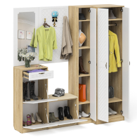 Комплектация состоит из шкафа для одежды и пенала объединенных в единый блок, высокой обувницы, тумбы с сиденьем, навесной вешалки и зеркала. Классический шкаф за распашными дверками которого расположены антресольная полка для головных уборов, горизонтальная штанга и нижняя ниша для обуви. Классический узкий пенал, за распашной дверью которого расположены 4 полки. Сторону открывания двери Вы определяете при сборке, что расширяет возможности удобной меблировки прихожей. Высокая обувница оборудована ящиком для мелочей сверху и двумя отделениями с откидными фасадами для обуви. Компактная маленькая обувница без полок за откидной дверкой. За откидной дверцей достаточно места для нескольких пар обуви. Обувница оборудована мягким сиденьем - ее можно использовать в качестве банкетки с комфортом обуваясь перед выходом. Для фиксации откидных фасадов используется газлифт мебельный. Максимальная нагрузка составляет 5 кг. Классическая прямоугольная настенная вешалка с крючками. Оборудована тремя трехрожковыми крючками для одежды. Глубина вешалки - 16 мм., 9,3 см.- это глубина с учетом крючков. Зеркало в раме из МДФ. Крепления вешалки и зеркала к стене в комплектацию не входит. Ручки в виде скоб выполнены из металла в цвете бронза. Выдвижной ящик установлен на металлические направляющие, обеспечивающие надёжное прямолинейное движение. Двери закреплены на четырёхшарнирных петлях. Фасады выполнены из МДФ односторонней белой 16 мм. и покрыта плёнкой ПВХ 0,3 мм. белое дерево. Декоративная фрезеровка Ромб служит отличным дополнением к общему светлому тону фасада. Корпуса выполнены из ламинированной ДСП 16 мм., которая имеет гигиенический сертификат Е1 и относится к самой безопасной группе ДСП. Торцы деталей облицованы кромкой ПВХ 2 мм. и 0,4 мм., что улучшает эстетический вид и продлевает срок службы обувнице. На опорах мебели используются пластиковые подпятники, сохраняющие Ваше напольное покрытие от повреждений. Поставляется полный набор мебели для прихожей П-6 компоновка № 31 в разобранном виде в надёжной упаковке, с комплектом сборочной фурнитуры и инструкцией по сборке. Изображения полного набора мебели для прихожей П-6 компоновка № 31 Вы можете найти выше в начале страницы.