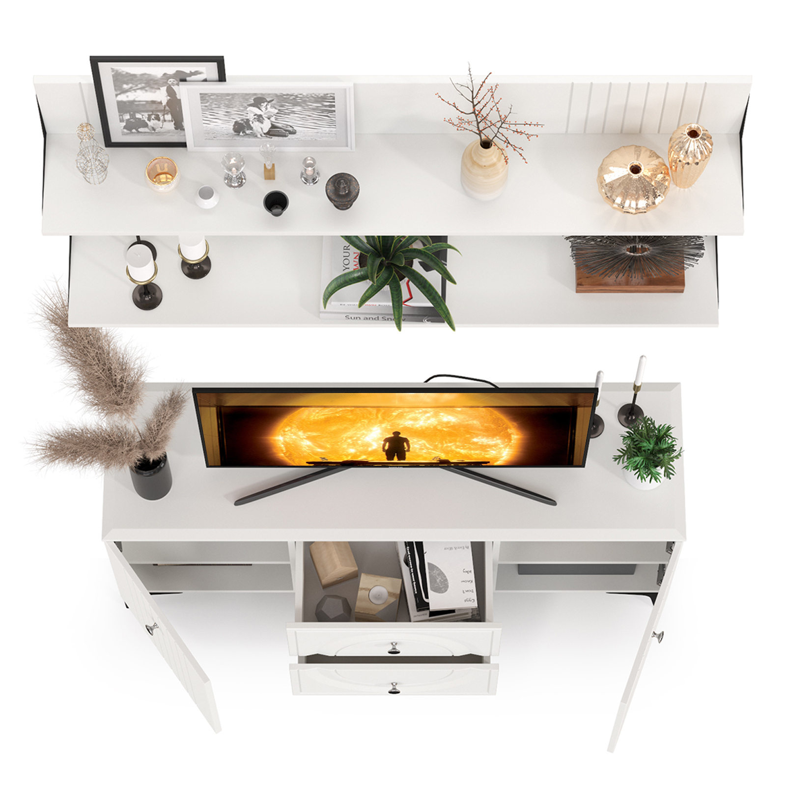 Тумба для ТВ с двумя навесными полками Валенсия № 51 - стильный минимальный набор для светлой гостиной в популярном стиле ар-деко.