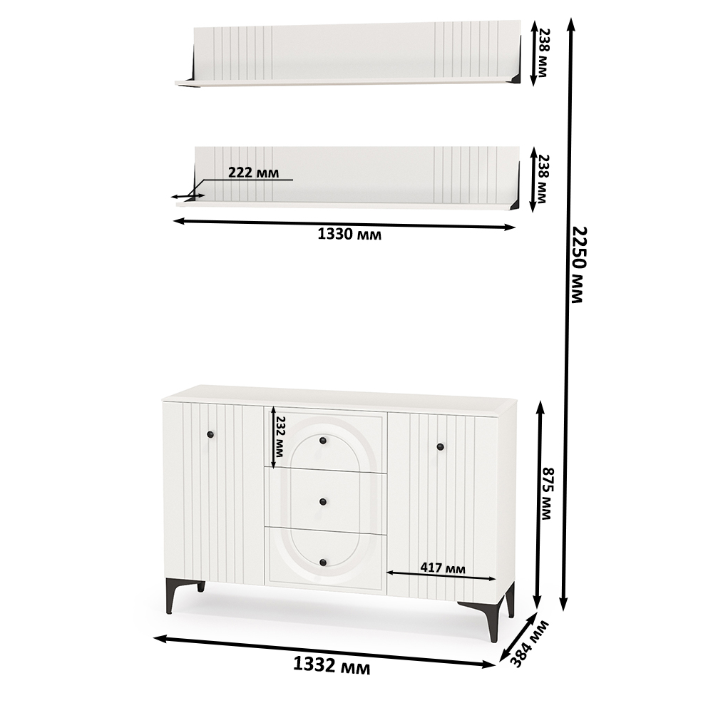 Графичное и стильное сочетание белоснежных фасадов и черных деталей эффектно расставляет акценты на мебели. Геометрический рисунок фрезеровки на белоснежных фасадах даёт развитый светотеневой рисунок. Комплектация состоит из ТВ-тумбы-комода Валенсия 13.309 и двух полок Валенсия 16.481. Широкий комод с распашными дверками по бокам и тремя выдвижными ящиками в центре - вместительный и функциональный. Можно использовать как ТВ-тумбу. Ящики комода установлены на направляющие скрытого монтажа с доводчиками. Двери закреплены на четырехшарнирных петлях. Установлен комод на высокие ножки, что делает конструкцию лёгкой и воздушной и практичной в плане уборки. Над комодом расположены две навесные открытые полки с задней панелью из МДФ. Полочка и задняя панель, каждой соединены металлическими кронштейнами черного цвета, усиливающие конструкцию и служащими креплениями к стене. Мебель выполнена из экологически чистой ламинированной ДСП 16 мм, класса эмиссии Е1, детали обработаны ПВХ-кромкой. Фасады из МДФ с матовой ПВХ-плёнкой. Такое решение делает мебель визуально более "мягкой", комфортной и расслабляющей, что особенно актуально для спальни. Поставляется в разобранном виде в надёжной упаковке, с комплектом сборочной фурнитуры и инструкцией по сборке. ТВ-тумба-Комод Валенсия 13.309 с двумя навесными полками № 89 - элементы из модульного набора мебели Валенсия.