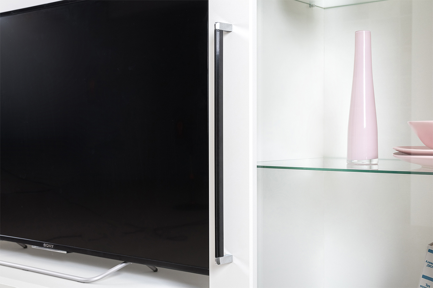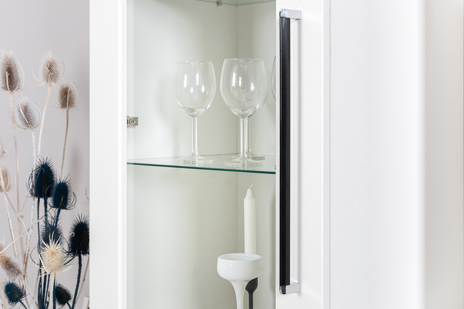 Графичное и стильное сочетание белоснежных фасадов и черных деталей эффектно расставляет акценты на мебели. Геометричный рисунок фрезеровки на белоснежных фасадах даёт развитый светотеневой рисунок. Конструктивно два пенала Валенсия 13.218 объединены в единый блок. Каждый пенал (в комплектации 2 единицы) украшен оригинальной стеклянной вставкой на фасаде, за которой расположены стеклянные полки. За распашной дверкой каждого, расположены 6 полок - четыре верхние полочки выполнены из стекла, нижние две из ЛДСП. Универсальная сборка - сторону открывания двери Вы определяете при сборке. Двери закреплены на четырехшарнирных петлях. Установлена мебель на высокие ножки, что делает конструкцию лёгкой и воздушной и практичной в плане уборки. Мебель выполнена из экологически чистой ламинированной ДСП 16 мм, класса эмиссии Е1, детали обработаны ПВХ-кромкой. Фасады из МДФ с матовой ПВХ-плёнкой. Такое решение делает мебель визуально более "мягкой", комфортной и расслабляющей, что особенно актуально для спальни. Поставляется в разобранном виде в надёжной упаковке, с комплектом сборочной фурнитуры и инструкцией по сборке. Два пенала со стеклом в гостиную Валенсия № 129 - элементы из модульного набора мебели Валенсия.