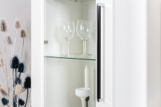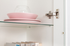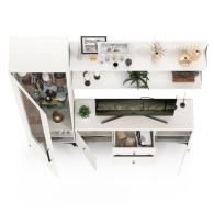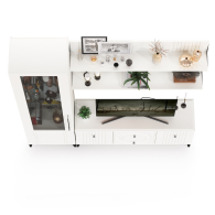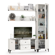 Графичное и стильное сочетание белоснежных фасадов и черных деталей эффектно расставляет акценты на мебели. Геометричный рисунок фрезеровки на белоснежных фасадах даёт развитый светотеневой рисунок. Комплектация состоит из ТВ-тумбы Валенсия 16.45, пенала Валенсия 13.218 и двух полок Валенсия 16.481. ТВ-тумба Валенсия 16.45 оснащена двумя выдвижными ящиками по центру и нишами с полкой за распашными дверками по краям. Над тумбой расположены две навесные открытые полки с задней панелью из МДФ. Каждая полочка и задняя панель соединены металлическими кронштейнами черного цвета, усиливающие конструкцию и служащими креплениями к стене. Пенал Валенсия 13.218 украшен оригинальной стеклянной вставкой на фасаде, за которой расположены стеклянные полки. За стеклянной дверкой расположены 6 полок - четыре верхние полочки выполнены из стекла, нижние две из ЛДСП. Универсальная сборка - сторону открывания двери Вы определяете при сборке. Ящики установлены на направляющие скрытого монтажа с доводчиками. Двери закреплены на четырехшарнирных петлях. Установлена мебель на высокие ножки, что делает конструкцию лёгкой и воздушной и практичной в плане уборки. Мебель выполнена из экологически чистой ламинированной ДСП 16 мм, класса эмиссии Е1, детали обработаны ПВХ-кромкой. Фасады из МДФ с матовой ПВХ-плёнкой. Такое решение делает мебель визуально более ""мягкой"", комфортной и расслабляющей, что особенно актуально для спальни. Поставляется в разобранном виде в надёжной упаковке, с комплектом сборочной фурнитуры и инструкцией по сборке. Тумба под ТВ с пеналом и двумя навесными полками Валенсия № 06 - элементы из модульного набора мебели Валенсия.