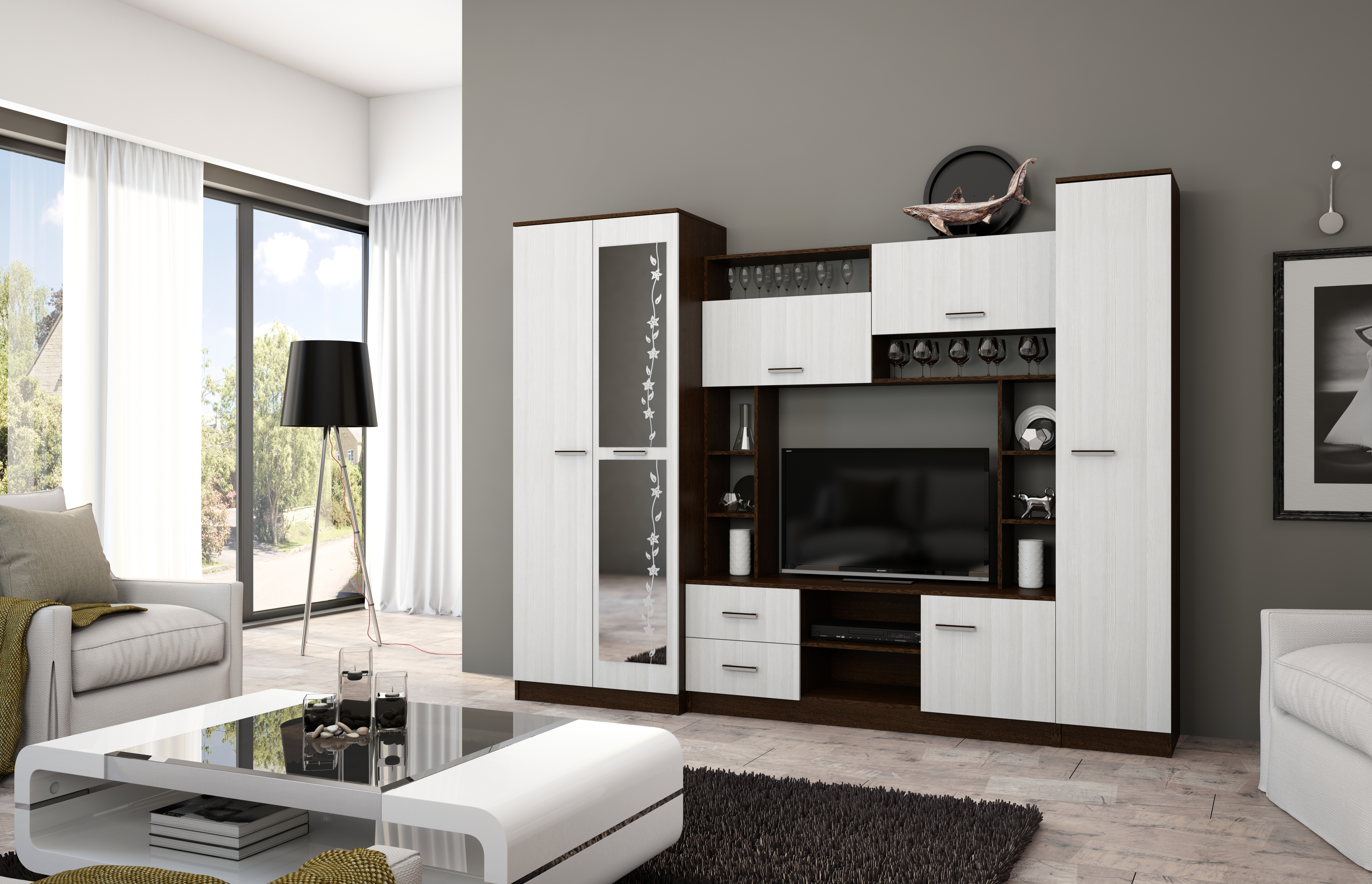 Сервант и ТВ-тумба с навесной полкой Валенсия № 58 - стильный набор для светлой гостиной в популярном стиле ар-деко.