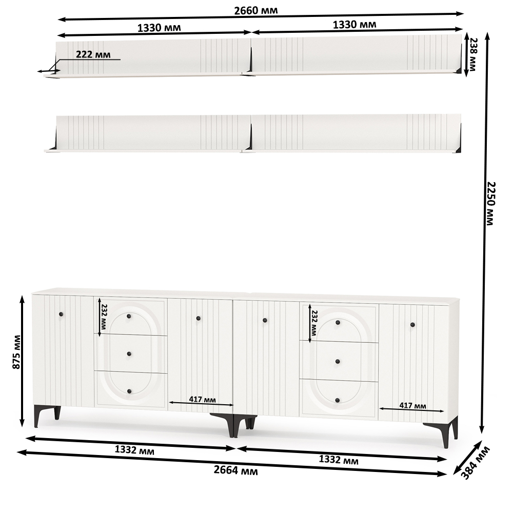 Графичное и стильное сочетание белоснежных фасадов и черных деталей эффектно расставляет акценты на мебели. Геометричный рисунок фрезеровки на белоснежных фасадах даёт развитый светотеневой рисунок. Комплектация состоит из двух комодов Валенсия 13.309 и четырех навесных полок Валенсия 16.481. Каждый комод с распашными дверками по бокам и тремя выдвижными ящиками в центре - вместительный и функциональный. Можно использовать как широкую ТВ-тумбу. Над комодами расположены четыре навесные открытые полки с задней панелью из МДФ. Полочка и задняя панель, каждой полки соединены металлическими кронштейнами черного цвета, усиливающие конструкцию и служащими креплениями к стене. Ящики установлены на направляющие скрытого монтажа с доводчиками. Двери закреплены на четырехшарнирных петлях. Установлена мебель на высокие ножки, что делает конструкцию лёгкой и воздушной и практичной в плане уборки. Мебель выполнена из экологически чистой ламинированной ДСП 16 мм, класса эмиссии Е1, детали обработаны ПВХ-кромкой. Фасады из МДФ с матовой ПВХ-плёнкой. Такое решение делает мебель визуально более ""мягкой"", комфортной и расслабляющей, что особенно актуально для спальни. Поставляется в разобранном виде в надёжной упаковке, с комплектом сборочной фурнитуры и инструкцией по сборке.