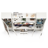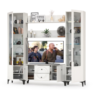 Графичное и стильное сочетание белоснежных фасадов и черных деталей эффектно расставляет акценты на мебели. Геометричный рисунок фрезеровки на белоснежных фасадах даёт развитый светотеневой рисунок. Комплектация состоит из ТВ-тумбы Валенсия 16.45, двух пеналов Валенсия 13.218 и двух навесных полок Валенсия 16.481. Тумба под ТВ Валенсия 16.45 расположена по центру. Тумба под ТВ Валенсия 16.45 оснащена двумя выдвижными ящиками по центру и нишами с полкой за распашными дверками по краям. Над тумбой расположены две навесные открытые полки с задней панелью из МДФ. Полочка и задняя панель, каждой соединены металлическими кронштейнами черного цвета, усиливающие конструкцию и служащими креплениями к стене. Два пенала Валенсия 13.218 располагаются по краям, обазуя приятную стеночку для гостиной. Каждый пенал украшен оригинальной стеклянной вставкой на фасаде, за которой расположены стеклянные полки. За дверкой каждого пенала расположены 6 полок - четыре верхние полочки выполнены из стекла, нижние две из ЛДСП. Универсальная сборка - сторону открывания двери Вы определяете при сборке. Ящики установлены на направляющие скрытого монтажа с доводчиками. Двери закреплены на четырехшарнирных петлях. Установлена мебель на высокие ножки, что делает конструкцию лёгкой и воздушной и практичной в плане уборки. Мебель выполнена из экологически чистой ламинированной ДСП 16 мм, класса эмиссии Е1, детали обработаны ПВХ-кромкой. Фасады из МДФ с матовой ПВХ-плёнкой. Такое решение делает мебель визуально более ""мягкой"", комфортной и расслабляющей, что особенно актуально для спальни. Поставляется в разобранном виде в надёжной упаковке, с комплектом сборочной фурнитуры и инструкцией по сборке.