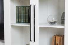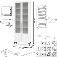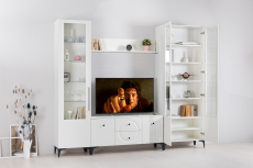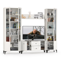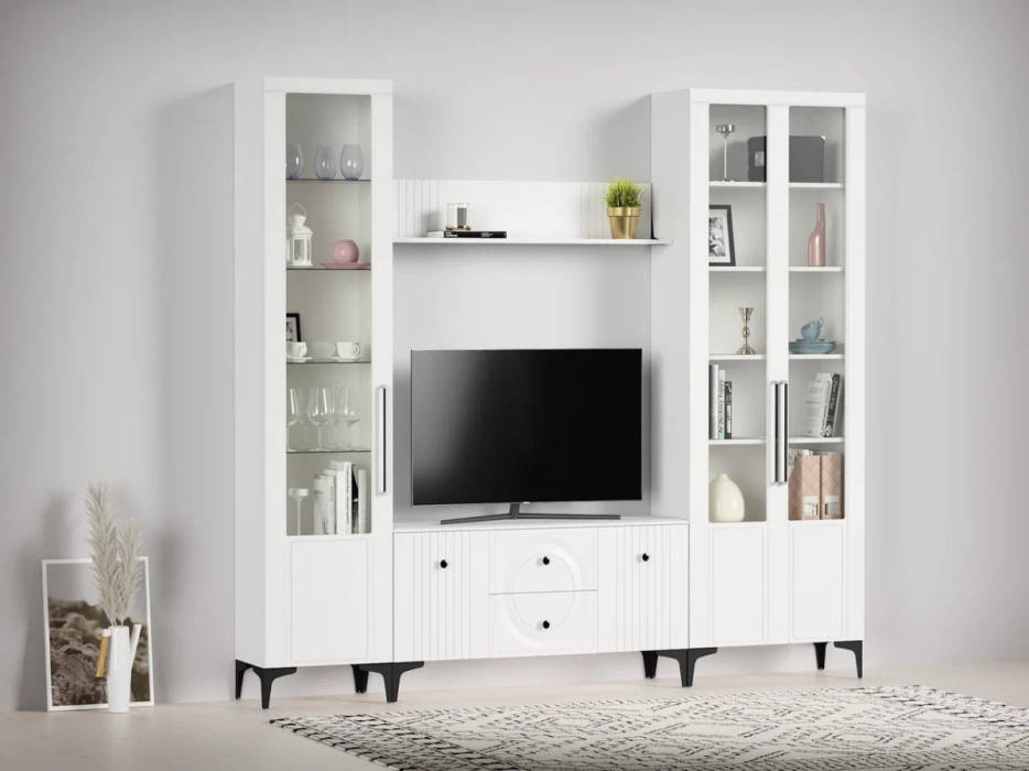 Графичное и стильное сочетание белоснежных фасадов и черных деталей эффектно расставляет акценты на мебели. Геометричный рисунок фрезеровки на белоснежных фасадах даёт развитый светотеневой рисунок. Комплектация состоит из ТВ-тумбы Валенсия 16.45, пенала Валенсия 13.218, серванта Валенсия 13.217 и навесной полки Валенсия 16.481. Тумба под ТВ Валенсия 16.45 оснащена двумя выдвижными ящиками по центру и нишами с полкой за распашными дверками по краям. Над тумбой расположена навесная открытая полка с задней панелью из МДФ. Полочка и задняя панель соединены металлическими кронштейнами черного цвета, усиливающие конструкцию и служащими креплениями к стене. Двухдверный сервант Валенсия 13.217 оснащен стеклянными вставками в дверях. Можно использовать как книжный шкаф и как витрину для наград, фотографий, поделок или элементов декора. За распашными дверями серванта расположены 6 полок из ЛДСП. Пенал украшен оригинальной стеклянной вставкой на фасаде, за которой расположены стеклянные полки. За дверкой пенала расположены 6 полок - четыре верхние полочки выполнены из стекла, нижние две из ЛДСП. Универсальная сборка - сторону открывания двери Вы определяете при сборке. Ящики установлены на направляющие скрытого монтажа с доводчиками. Двери закреплены на четырехшарнирных петлях. Установлена мебель на высокие ножки, что делает конструкцию лёгкой и воздушной и практичной в плане уборки. Мебель выполнена из экологически чистой ламинированной ДСП 16 мм, класса эмиссии Е1, детали обработаны ПВХ-кромкой. Фасады из МДФ с матовой ПВХ-плёнкой. Такое решение делает мебель визуально более ""мягкой"", комфортной и расслабляющей, что особенно актуально для спальни. Поставляется в разобранном виде в надёжной упаковке, с комплектом сборочной фурнитуры и инструкцией по сборке.