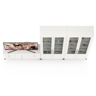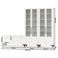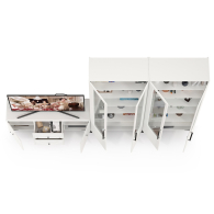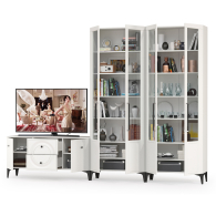 Графичное и стильное сочетание белоснежных фасадов и черных деталей эффектно расставляет акценты на мебели. Геометричный рисунок фрезеровки на белоснежных фасадах даёт развитый светотеневой рисунок. Комплектация состоит из ТВ-тумбы Валенсия 16.45 и двух сервантов Валенсия 13.217. Тумба под ТВ Валенсия 16.45 оснащена двумя выдвижными ящиками по центру и нишами с полкой за распашными дверками по краям. Два серванта Валенсия 13.217 объединены в стенку-библиотеку. Каждый двухдверный сервант оснащен стеклянными вставками в дверях. Можно использовать как книжный шкаф и как витрину для наград, фотографий, поделок или элементов декора. За распашными дверями каждого серванта расположены 6 полок из ЛДСП. Ящики установлены на направляющие скрытого монтажа с доводчиками. Двери закреплены на четырехшарнирных петлях. Установлена мебель на высокие ножки, что делает конструкцию лёгкой и воздушной и практичной в плане уборки. Мебель выполнена из экологически чистой ламинированной ДСП 16 мм, класса эмиссии Е1, детали обработаны ПВХ-кромкой. Фасады из МДФ с матовой ПВХ-плёнкой. Такое решение делает мебель визуально более ""мягкой"", комфортной и расслабляющей, что особенно актуально для спальни. Поставляется в разобранном виде в надёжной упаковке, с комплектом сборочной фурнитуры и инструкцией по сборке.