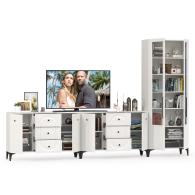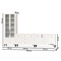 Графичное и стильное сочетание белоснежных фасадов и черных деталей эффектно расставляет акценты на мебели. Геометричный рисунок фрезеровки на белоснежных фасадах даёт развитый светотеневой рисунок. Комплектация состоит из двух комод-ТВ-тумб Валенсия 13.309 и серванта Валенсия 13.217. Конструктивно два комода Валенсия 13.309 объединены в единый блок и образуют широкую и вместительную ТВ-тумбу. Каждый комод с распашными дверками по бокам и тремя выдвижными ящиками в центре - вместительный и функциональный. Можно использовать как широкую ТВ-тумбу. Двухдверный сервант Валенсия 13.217 оснащен стеклянными вставками в дверях. Можно использовать как книжный шкаф и как витрину для наград, фотографий, поделок или элементов декора. За распашными дверями серванта расположены 6 полок из ЛДСП. Ящики установлены на направляющие скрытого монтажа с доводчиками. Двери закреплены на четырехшарнирных петлях. Установлена мебель на высокие ножки, что делает конструкцию лёгкой и воздушной и практичной в плане уборки. Мебель выполнена из экологически чистой ламинированной ДСП 16 мм, класса эмиссии Е1, детали обработаны ПВХ-кромкой. Фасады из МДФ с матовой ПВХ-плёнкой. Такое решение делает мебель визуально более ""мягкой"", комфортной и расслабляющей, что особенно актуально для спальни. Поставляется в разобранном виде в надёжной упаковке, с комплектом сборочной фурнитуры и инструкцией по сборке.