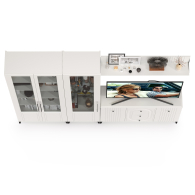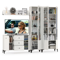 Графичное и стильное сочетание белоснежных фасадов и черных деталей эффектно расставляет акценты на мебели. Геометричный рисунок фрезеровки на белоснежных фасадах даёт развитый светотеневой рисунок. Комплектация состоит из комод-ТВ-тумбы Валенсия 13.309, пенала Валенсия 13.218, серванта Валенсия 13.217 и навесной полки Валенсия 16.481. Широкий комод с распашными дверками по бокам и тремя выдвижными ящиками в центре - вместительный и функциональный. Можно использовать как ТВ-тумбу. Над тумбой расположена навесная открытая полка с задней панелью из МДФ. Полочка и задняя панель соединены металлическими кронштейнами черного цвета, усиливающие конструкцию и служащими креплениями к стене. Сервант и пенал объединены в стенку-библиотеку. Двухдверный сервант Валенсия 13.217 оснащен стеклянными вставками в дверях. Можно использовать как книжный шкаф и как витрину для наград, фотографий, поделок или элементов декора. За распашными дверями серванта расположены 6 полок из ЛДСП. Пенал украшен оригинальной стеклянной вставкой на фасаде, за которой расположены стеклянные полки. За дверкой пенала расположены 6 полок - четыре верхние полочки выполнены из стекла, нижние две из ЛДСП. Универсальная сборка - сторону открывания двери Вы определяете при сборке. Ящики установлены на направляющие скрытого монтажа с доводчиками. Двери закреплены на четырехшарнирных петлях. Установлена мебель на высокие ножки, что делает конструкцию лёгкой и воздушной и практичной в плане уборки. Мебель выполнена из экологически чистой ламинированной ДСП 16 мм, класса эмиссии Е1, детали обработаны ПВХ-кромкой. Фасады из МДФ с матовой ПВХ-плёнкой. Такое решение делает мебель визуально более ""мягкой"", комфортной и расслабляющей, что особенно актуально для спальни. Поставляется в разобранном виде в надёжной упаковке, с комплектом сборочной фурнитуры и инструкцией по сборке.