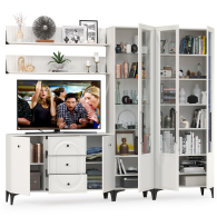 Графичное и стильное сочетание белоснежных фасадов и черных деталей эффектно расставляет акценты на мебели. Геометричный рисунок фрезеровки на белоснежных фасадах даёт развитый светотеневой рисунок. Комплектация состоит из комод-ТВ-тумбы Валенсия 13.309, пенала Валенсия 13.218, серванта Валенсия 13.217 и двух навесных полок Валенсия 16.481. Широкий комод с распашными дверками по бокам и тремя выдвижными ящиками в центре - вместительный и функциональный. Можно использовать как ТВ-тумбу. Над тумбой расположены две навесные открытые полки с задней панелью из МДФ. Полочка и задняя панель, каждой соединены металлическими кронштейнами черного цвета, усиливающие конструкцию и служащими креплениями к стене. Сервант и пенал объединены в стенку-библиотеку. Двухдверный сервант Валенсия 13.217 оснащен стеклянными вставками в дверях. Можно использовать как книжный шкаф и как витрину для наград, фотографий, поделок или элементов декора. За распашными дверями серванта расположены 6 полок из ЛДСП. Пенал украшен оригинальной стеклянной вставкой на фасаде, за которой расположены стеклянные полки. За дверкой пенала расположены 6 полок - четыре верхние полочки выполнены из стекла, нижние две из ЛДСП. Универсальная сборка - сторону открывания двери Вы определяете при сборке. Ящики установлены на направляющие скрытого монтажа с доводчиками. Двери закреплены на четырехшарнирных петлях. Установлена мебель на высокие ножки, что делает конструкцию лёгкой и воздушной и практичной в плане уборки. Мебель выполнена из экологически чистой ламинированной ДСП 16 мм, класса эмиссии Е1, детали обработаны ПВХ-кромкой. Фасады из МДФ с матовой ПВХ-плёнкой. Такое решение делает мебель визуально более ""мягкой"", комфортной и расслабляющей, что особенно актуально для спальни. Поставляется в разобранном виде в надёжной упаковке, с комплектом сборочной фурнитуры и инструкцией по сборке.