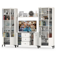 Графичное и стильное сочетание белоснежных фасадов и черных деталей эффектно расставляет акценты на мебели. Геометричный рисунок фрезеровки на белоснежных фасадах даёт развитый светотеневой рисунок. Комплектация состоит из комод-ТВ-тумбы Валенсия 13.309, двух сервантов Валенсия 13.217 и навесной полки Валенсия 16.481. Широкий комод с распашными дверками по бокам и тремя выдвижными ящиками в центре - вместительный и функциональный. Можно использовать как ТВ-тумбу. Над тумбой расположена навесная открытая полка с задней панелью из МДФ. Полочка и задняя панель соединены металлическими кронштейнами черного цвета, усиливающие конструкцию и служащими креплениями к стене. Два серванта Валенсия 13.217 по краям образуют отличную стеночку для гостиной. Каждый двухдверный сервант оснащен стеклянными вставками в дверях. Можно использовать как книжный шкаф и как витрину для наград, фотографий, поделок или элементов декора. За распашными дверями каждого серванта расположены 6 полок из ЛДСП. Ящики установлены на направляющие скрытого монтажа с доводчиками. Двери закреплены на четырехшарнирных петлях. Установлена мебель на высокие ножки, что делает конструкцию лёгкой и воздушной и практичной в плане уборки. Мебель выполнена из экологически чистой ламинированной ДСП 16 мм, класса эмиссии Е1, детали обработаны ПВХ-кромкой. Фасады из МДФ с матовой ПВХ-плёнкой. Такое решение делает мебель визуально более ""мягкой"", комфортной и расслабляющей, что особенно актуально для спальни. Поставляется в разобранном виде в надёжной упаковке, с комплектом сборочной фурнитуры и инструкцией по сборке.
