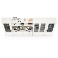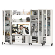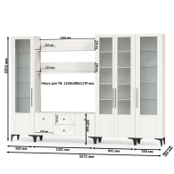 Графичное и стильное сочетание белоснежных фасадов и черных деталей эффектно расставляет акценты на мебели. Геометричный рисунок фрезеровки на белоснежных фасадах даёт развитый светотеневой рисунок. Комплектация состоит из ТВ-тумбы Валенсия 16.45, двух пеналов Валенсия 13.218, серванта Валенсия 13.217 и двух навесных полок Валенсия 16.481. Тумба под ТВ Валенсия 16.45 оснащена двумя выдвижными ящиками по центру и нишами с полкой за распашными дверками по краям. Над тумбой расположены две навесные открытые полки с задней панелью из МДФ. Полочка и задняя панель, каждой соединены металлическими кронштейнами черного цвета, усиливающие конструкцию и служащими креплениями к стене. С одной стороны расположен сервант и пенал объединеные в единый болок, с другой пенал завершает комплектацию, образуя солидную стеночку для гостиной. Двухдверный сервант Валенсия 13.217 оснащен стеклянными вставками в дверях. Можно использовать как книжный шкаф и как витрину для наград, фотографий, поделок или элементов декора. За распашными дверями серванта расположены 6 полок из ЛДСП. Каждый пенал (в комплектации 2 пенала) украшен оригинальной стеклянной вставкой на фасаде, за которой расположены стеклянные полки. За дверкой каждого пенала расположены 6 полок - четыре верхние полочки выполнены из стекла, нижние две из ЛДСП. Универсальная сборка - сторону открывания двери Вы определяете при сборке. Ящики установлены на направляющие скрытого монтажа с доводчиками. Двери закреплены на четырехшарнирных петлях. Установлена мебель на высокие ножки, что делает конструкцию лёгкой и воздушной и практичной в плане уборки. Мебель выполнена из экологически чистой ламинированной ДСП 16 мм, класса эмиссии Е1, детали обработаны ПВХ-кромкой. Фасады из МДФ с матовой ПВХ-плёнкой. Такое решение делает мебель визуально более ""мягкой"", комфортной и расслабляющей, что особенно актуально для спальни. Поставляется в разобранном виде в надёжной упаковке, с комплектом сборочной фурнитуры и инструкцией по сборке.