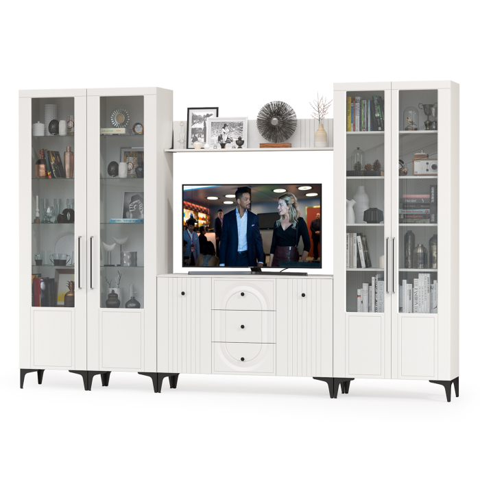 Графичное и стильное сочетание белоснежных фасадов и черных деталей эффектно расставляет акценты на мебели. Геометричный рисунок фрезеровки на белоснежных фасадах даёт развитый светотеневой рисунок. Комплектация состоит из комод-ТВ-тумбы Валенсия 13.309, двух пеналов Валенсия 13.218, серванта Валенсия 13.217 и навесной полки Валенсия 16.481. Широкий комод с распашными дверками по бокам и тремя выдвижными ящиками в центре - вместительный и функциональный. Можно использовать как ТВ-тумбу. Над тумбой расположены две навесные открытые полки с задней панелью из МДФ. Полочка и задняя панель, каждой соединены металлическими кронштейнами черного цвета, усиливающие конструкцию и служащими креплениями к стене. С одной стороны расположены 2 пенала объединеные в единый болок, с другой сервант завершает комплектацию и образуя солидную стеночку для гостиной. Двухдверный сервант Валенсия 13.217 оснащен стеклянными вставками в дверях. Можно использовать как книжный шкаф и как витрину для наград, фотографий, поделок или элементов декора. За распашными дверями серванта расположены 6 полок из ЛДСП. Каждый пенал (в комплектации 2 пенала) украшен оригинальной стеклянной вставкой на фасаде, за которой расположены стеклянные полки. За дверкой каждого пенала расположены 6 полок - четыре верхние полочки выполнены из стекла, нижние две из ЛДСП. Универсальная сборка - сторону открывания двери Вы определяете при сборке. Ящики установлены на направляющие скрытого монтажа с доводчиками. Двери закреплены на четырехшарнирных петлях. Установлена мебель на высокие ножки, что делает конструкцию лёгкой и воздушной и практичной в плане уборки. Мебель выполнена из экологически чистой ламинированной ДСП 16 мм, класса эмиссии Е1, детали обработаны ПВХ-кромкой. Фасады из МДФ с матовой ПВХ-плёнкой. Такое решение делает мебель визуально более ""мягкой"", комфортной и расслабляющей, что особенно актуально для спальни.