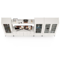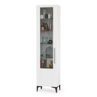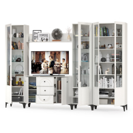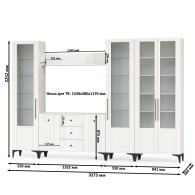 Графичное и стильное сочетание белоснежных фасадов и черных деталей эффектно расставляет акценты на мебели. Геометричный рисунок фрезеровки на белоснежных фасадах даёт развитый светотеневой рисунок. Комплектация состоит из комод-ТВ-тумбы Валенсия 13.309, двух пеналов Валенсия 13.218, серванта Валенсия 13.217 и навесной полки Валенсия 16.481. Широкий комод-ТВ-тумбы с распашными дверками по бокам и тремя выдвижными ящиками в центре - вместительный и функциональный. Можно использовать как ТВ-тумбу. Над тумбой расположена навесная открытая полка с задней панелью из МДФ. Полочка и задняя панель соединены металлическими кронштейнами черного цвета, усиливающие конструкцию и служащими креплениями к стене. С одной стороны расположены сервант и пенал объединеные в единый болок, с другой пенал завершает комплектацию и образуя солидную стеночку для гостиной. Двухдверный сервант Валенсия 13.217 оснащен стеклянными вставками в дверях. Можно использовать как книжный шкаф и как витрину для наград, фотографий, поделок или элементов декора. За распашными дверями серванта расположены 6 полок из ЛДСП. Каждый пенал (в комплектации 2 пенала) украшен оригинальной стеклянной вставкой на фасаде, за которой расположены стеклянные полки. За дверкой каждого пенала расположены 6 полок - четыре верхние полочки выполнены из стекла, нижние две из ЛДСП. Универсальная сборка - сторону открывания двери Вы определяете при сборке. Ящики установлены на направляющие скрытого монтажа с доводчиками. Двери закреплены на четырехшарнирных петлях. Установлена мебель на высокие ножки, что делает конструкцию лёгкой и воздушной и практичной в плане уборки. Мебель выполнена из экологически чистой ламинированной ДСП 16 мм, класса эмиссии Е1, детали обработаны ПВХ-кромкой. Фасады из МДФ с матовой ПВХ-плёнкой. Такое решение делает мебель визуально более ""мягкой"", комфортной и расслабляющей, что особенно актуально для спальни. Поставляется в разобранном виде в надёжной упаковке, с комплектом сборочной фурнитуры и инструкцией по сборке.