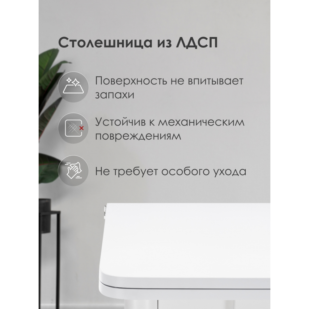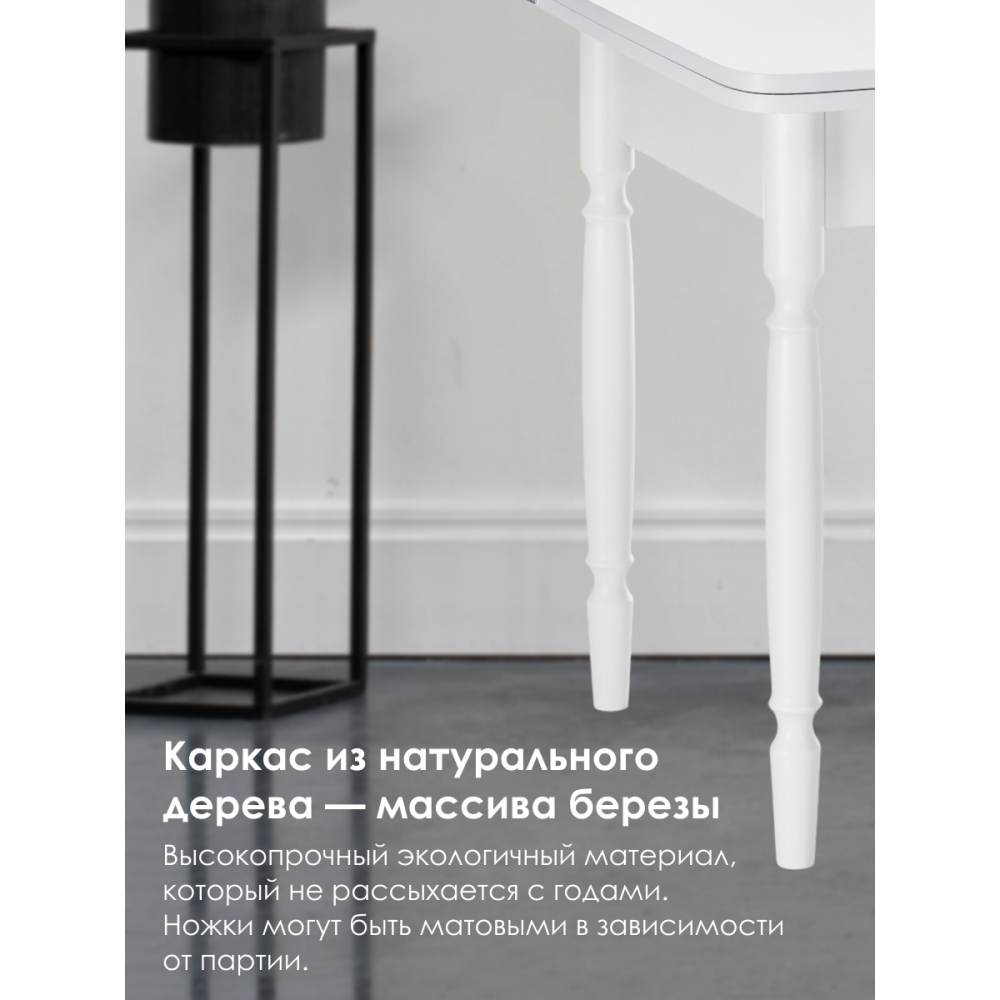 Расстояние между ножками по ширине: 41 см. Материал каркаса - Массив дерева; Материал ножек - Массив дерева; Материал столешницы - ЛДСП; Цвет каркаса - Белый; Цвет ножек - Белый; Цвет столешницы - Белый; Цвет подстолья - Белый; Ширина - 59; Высота - 75; Длина стола в разложенном виде - 120; Длина - 79.